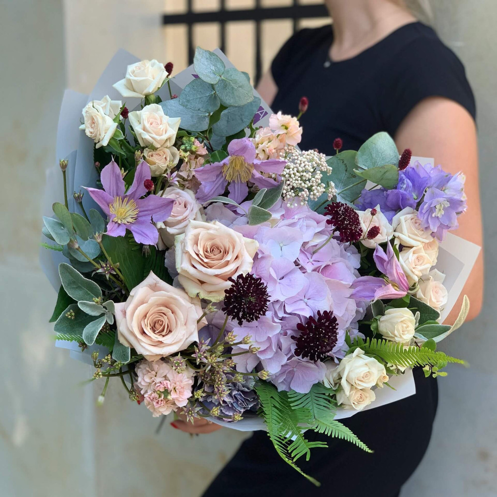 Квіти: Клематіс, Троянда, Троянда кущова, Скабіоза, Евкаліпт, Озотамнус, Матіола, Алліум, Діантус, Амбрела, Гортензія