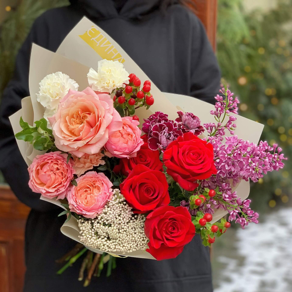 Квіти: Троянда піоновидна, Бузок, Озотамнус, Хіперикум, Діантус, Евкаліпт