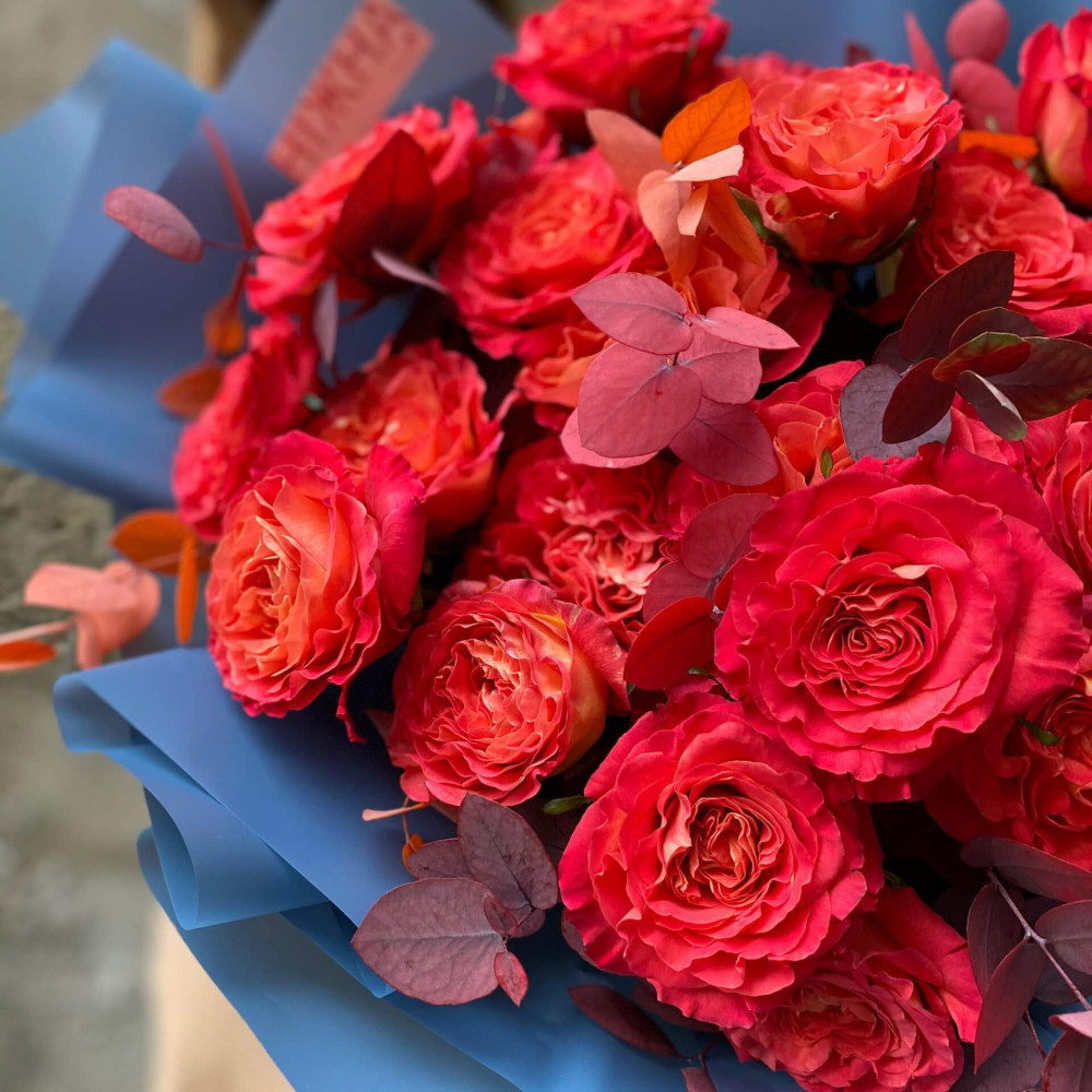 - Як замовити 25 червоних піоновидних троянд у букеті «Sunset»? ❯