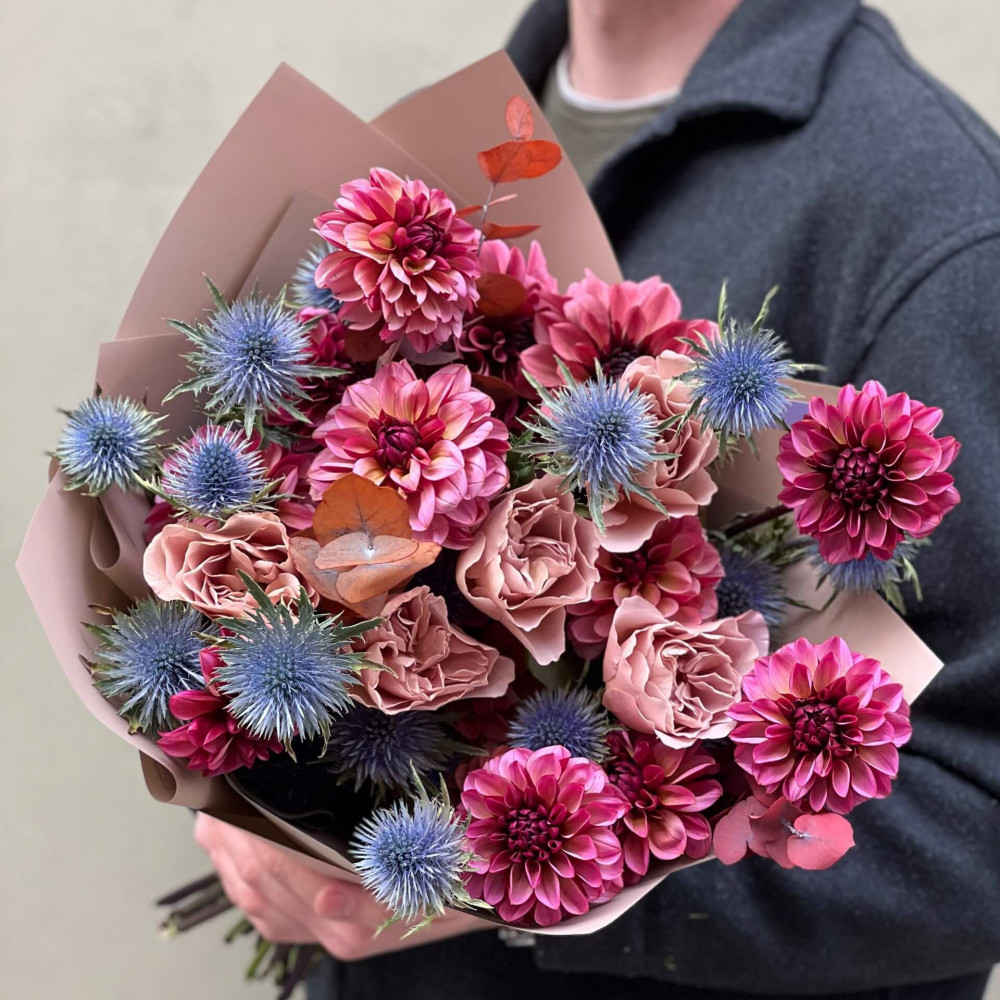 Квіти: Троянда піоновидна, Евкаліпт, Жоржина, Ерінгіум