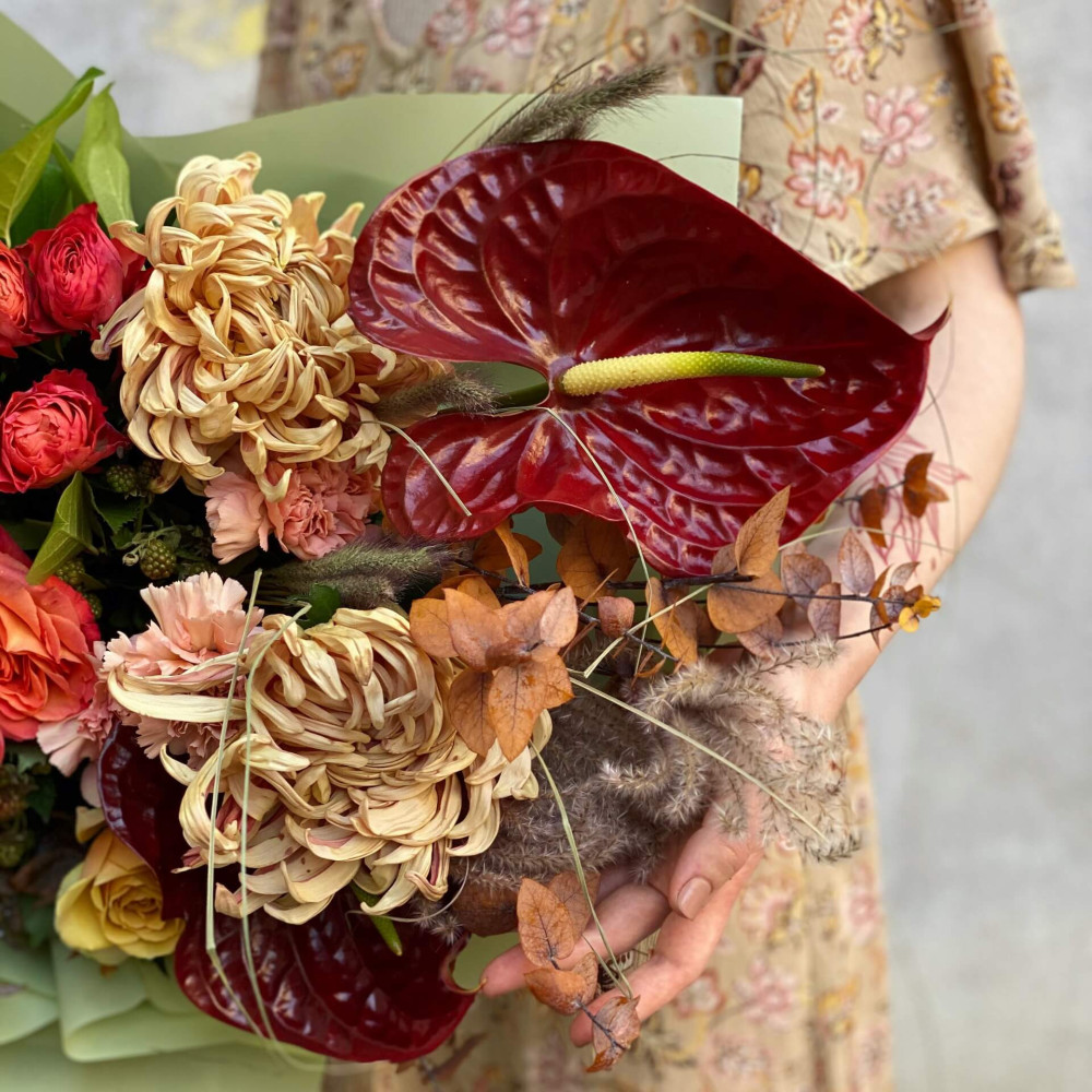 Квіти: Троянда, Троянда піоновидна, Хризантема, Жоржина, Антуріум, Скабіоза, Діантус, Рубус