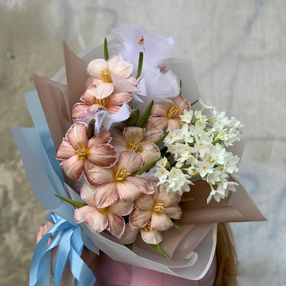 В кожен букет Kvitna вкладається сенс. Кожна квіточка на своєму місці і не просто так, як в цьому ніжному і весняному букеті - ароматні нарциси одаровують весною, додаємо нотку неординарності незвичайними тюльпанами, повітря і ніжність підкреслимо повітряним пір'ячком. Коли вона побачить наш букет точно скаже "ах"