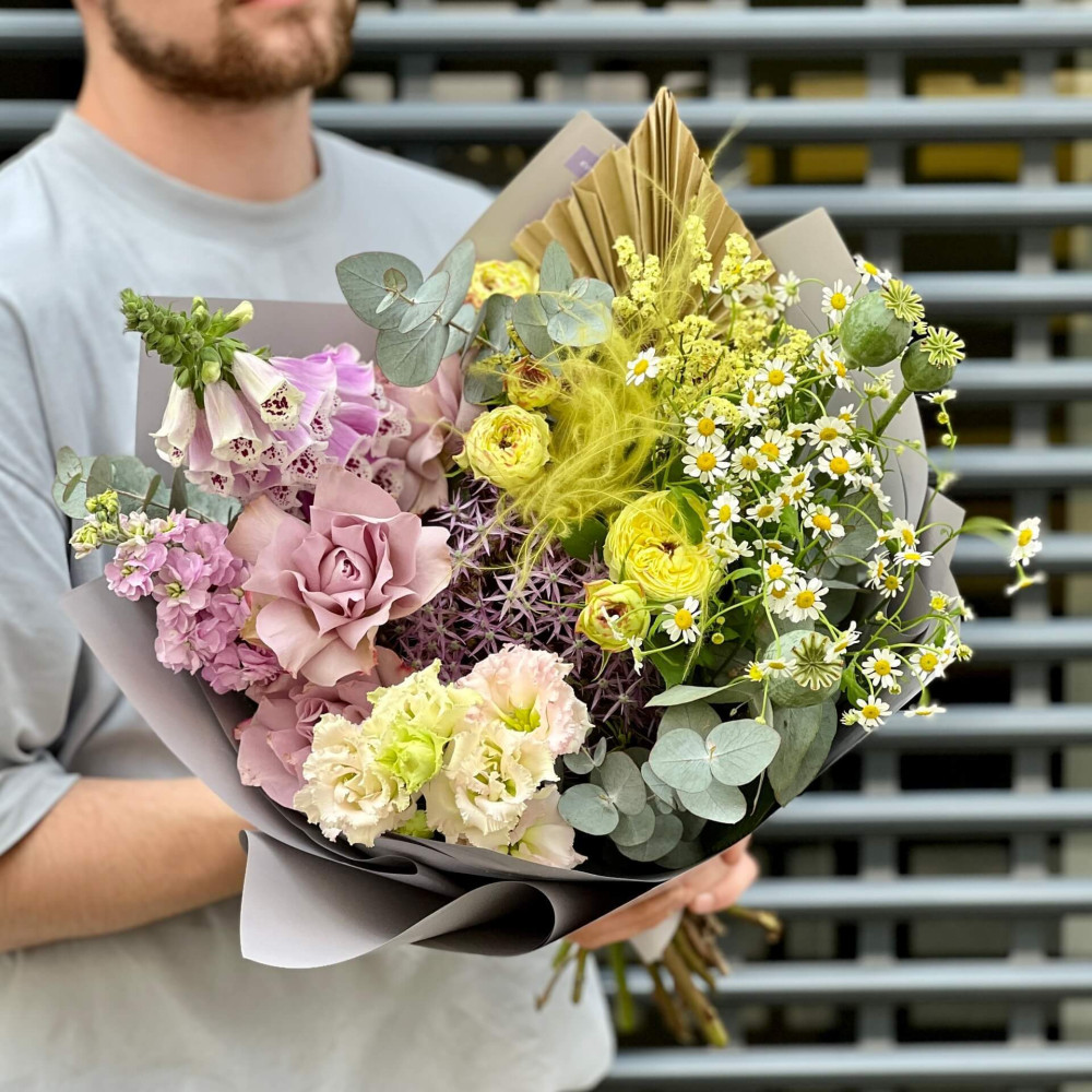 Квіти: Троянда, Матіола, Еустома, Евкаліпт, Троянда кущова, Папавер (Мак), Танацетум, Стіфа, Алліум, Кермек, Наперстянка