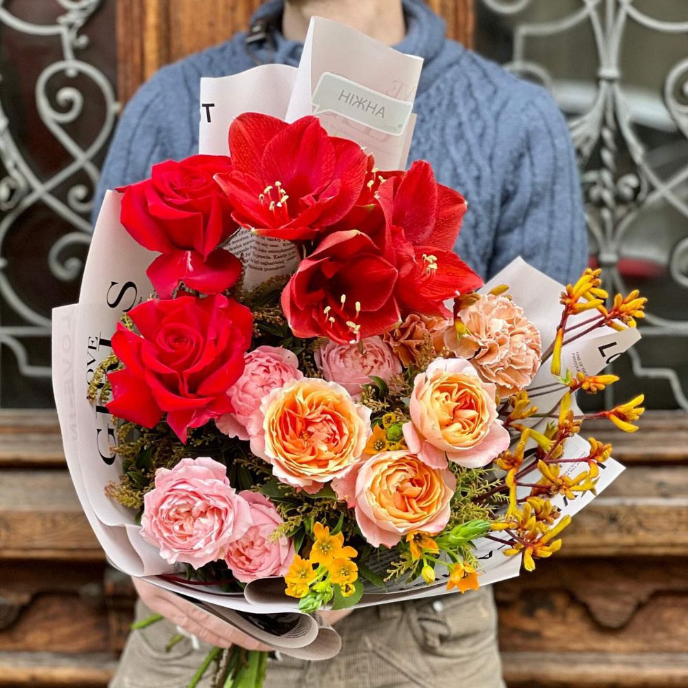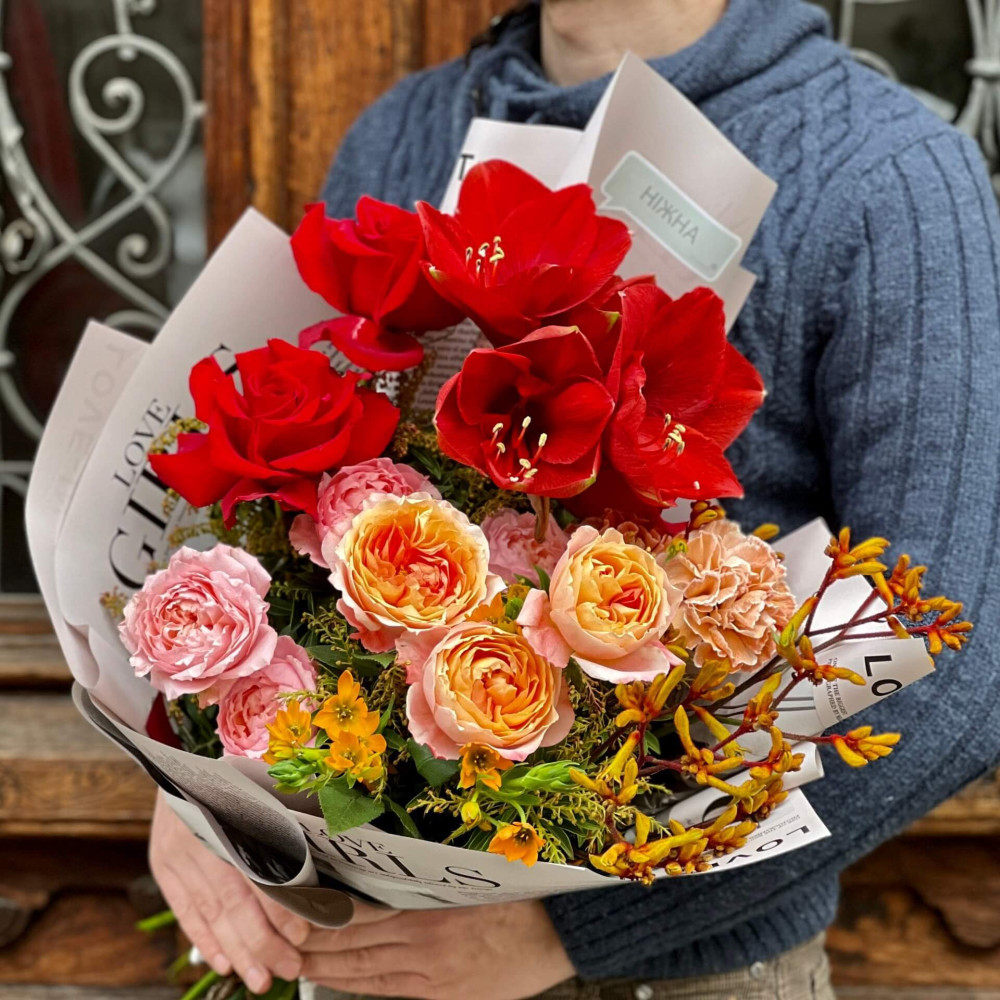 Створюючи мене, флорист надихнувся трояндовою романтичністю та пристрастю гранату. Червоні троянди та гіпеаструм ніби просять, акцентувати увагу саме на них. І не дарма, адже вони так гарно пасують рожевій ніжності.