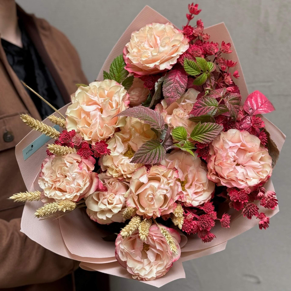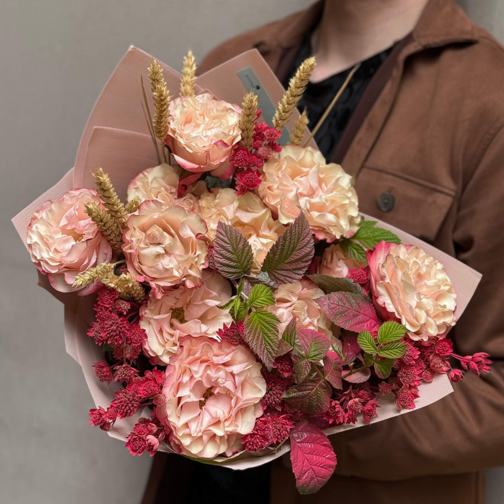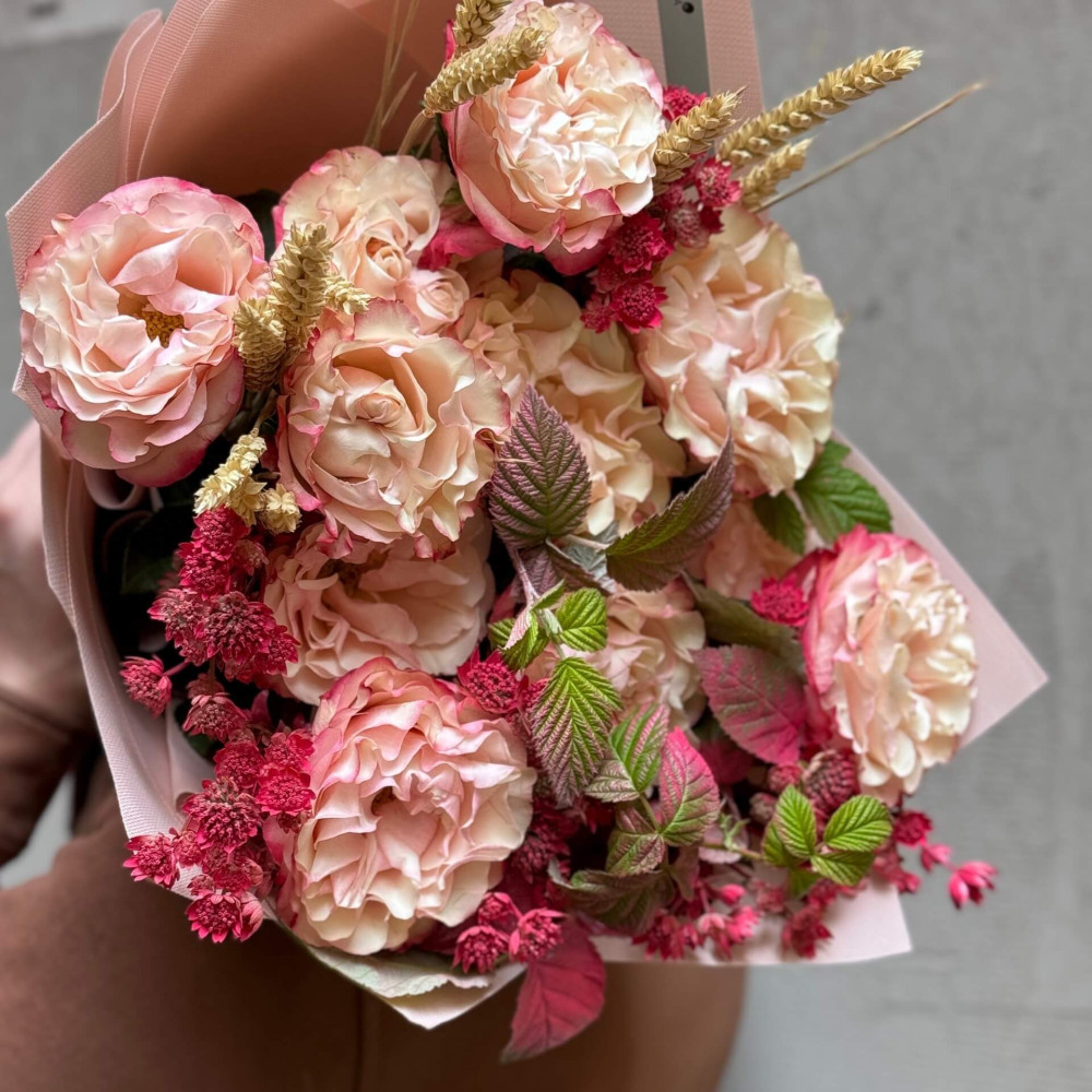 Квіти: Троянда Country Candy, Малина (листя), Астранція, Пшениця
