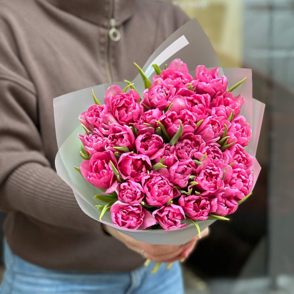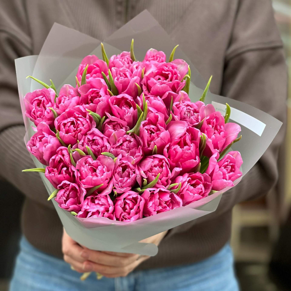 Рожево-бузкові піоновидні тюльпани продовжать рости у вазі, а їхні елегантні бутони перетворяться в пухнасті кулі пелюсток. Крапелька весни у середзим'ї.