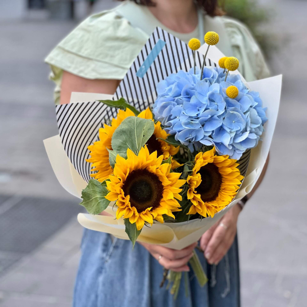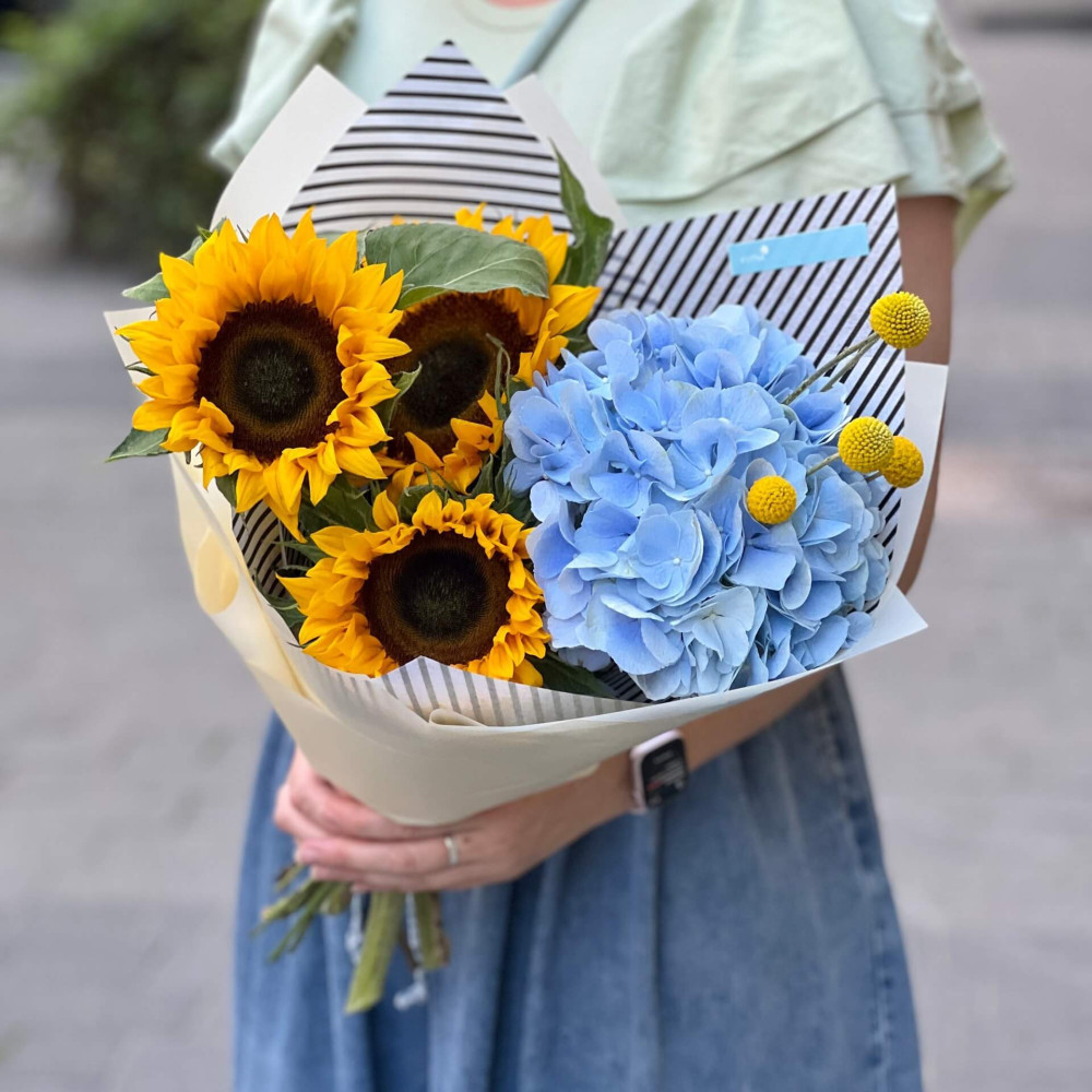 - Як замовити Букет із соняшником та гортензією «Сонячне небо»? ❯