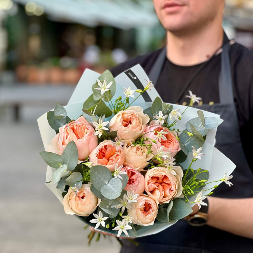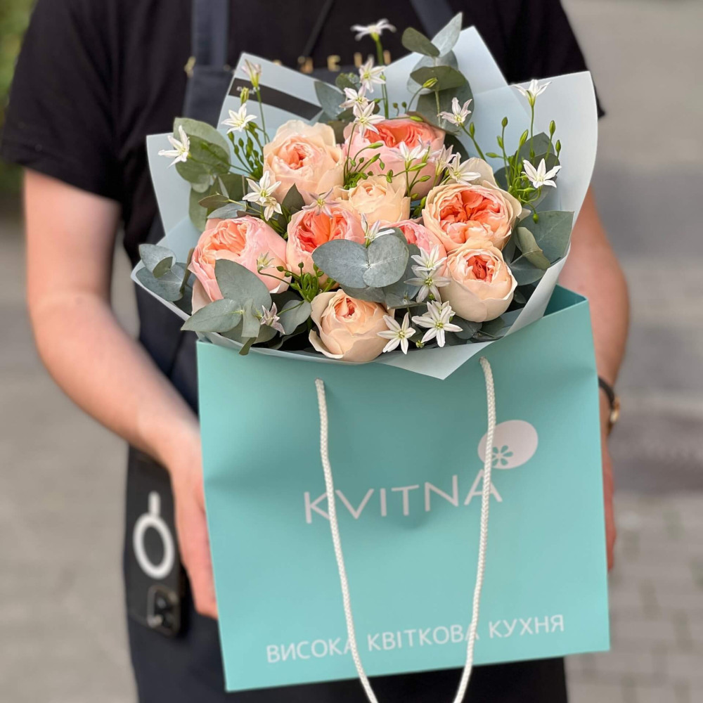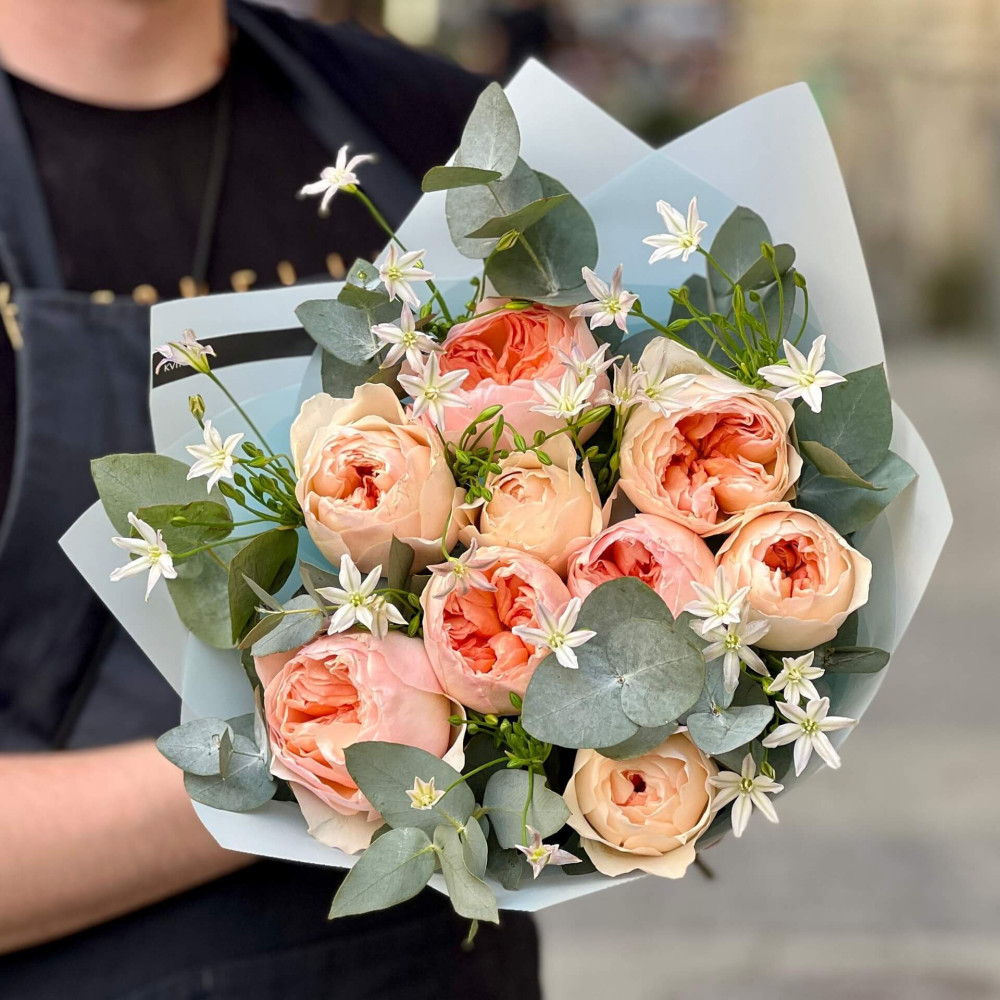 - Як замовити Букет із вишуканої піоновидної троянди Джульєтта «Персикові зорі»? ❯