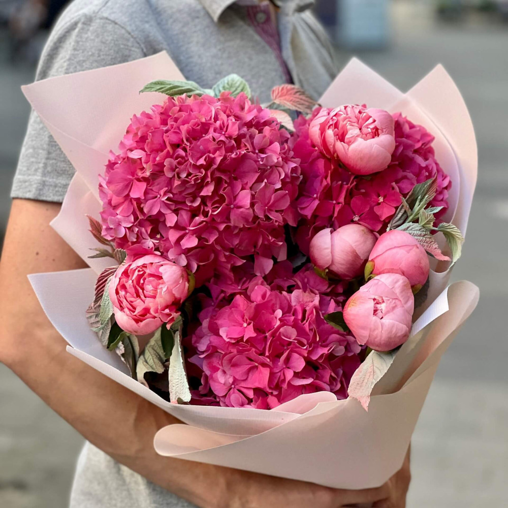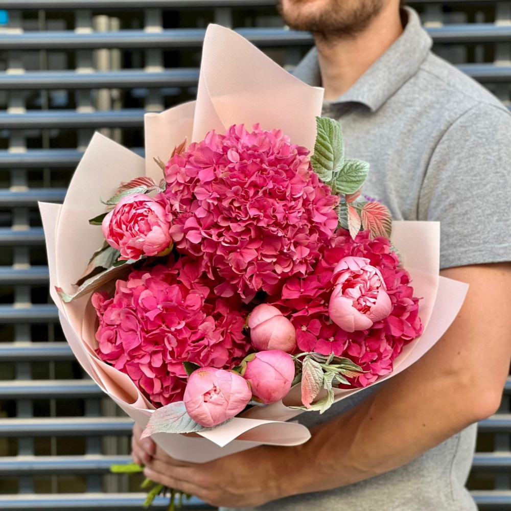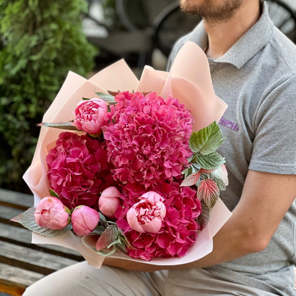 Насичена малинова гортензія, і чудові рожеві півонії – як хрумка серцевина найбільшої літньої ягоди, яка чудово освіжить в спеку. Так хочеться десерта з кавуна!