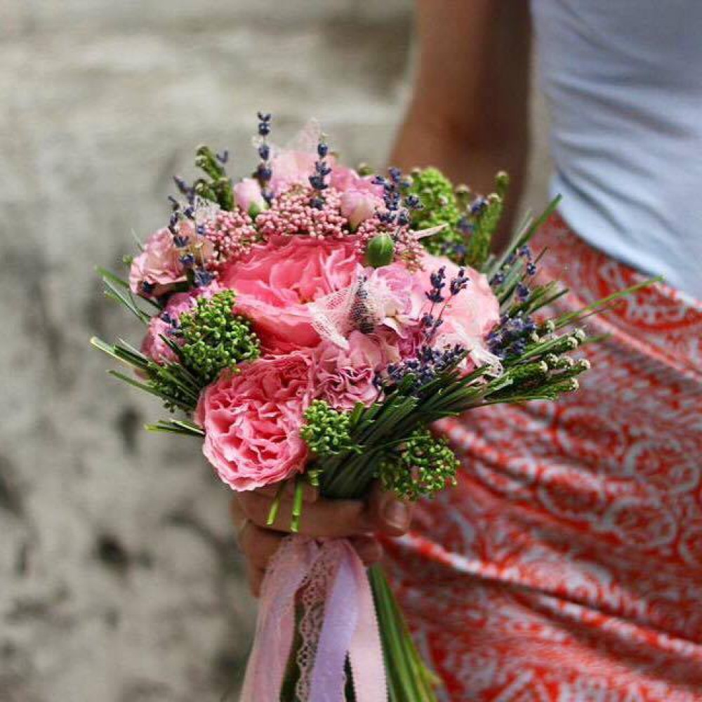 Невеликий витончений букет з троянд з вкрапленням лаванди