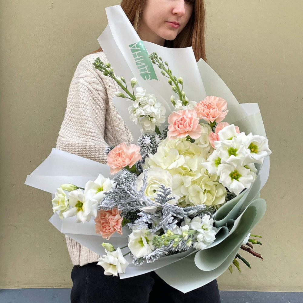 Квіти: Еустома, Діантус, Матіола, Гортензія, Нобіліс (ялинка)