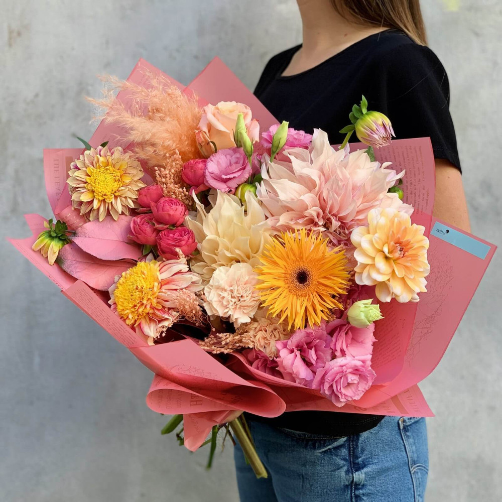 Квіти: Жоржина, Троянда, Троянда піоновидна, Еустома, Діантус, Салал, Кортадерія