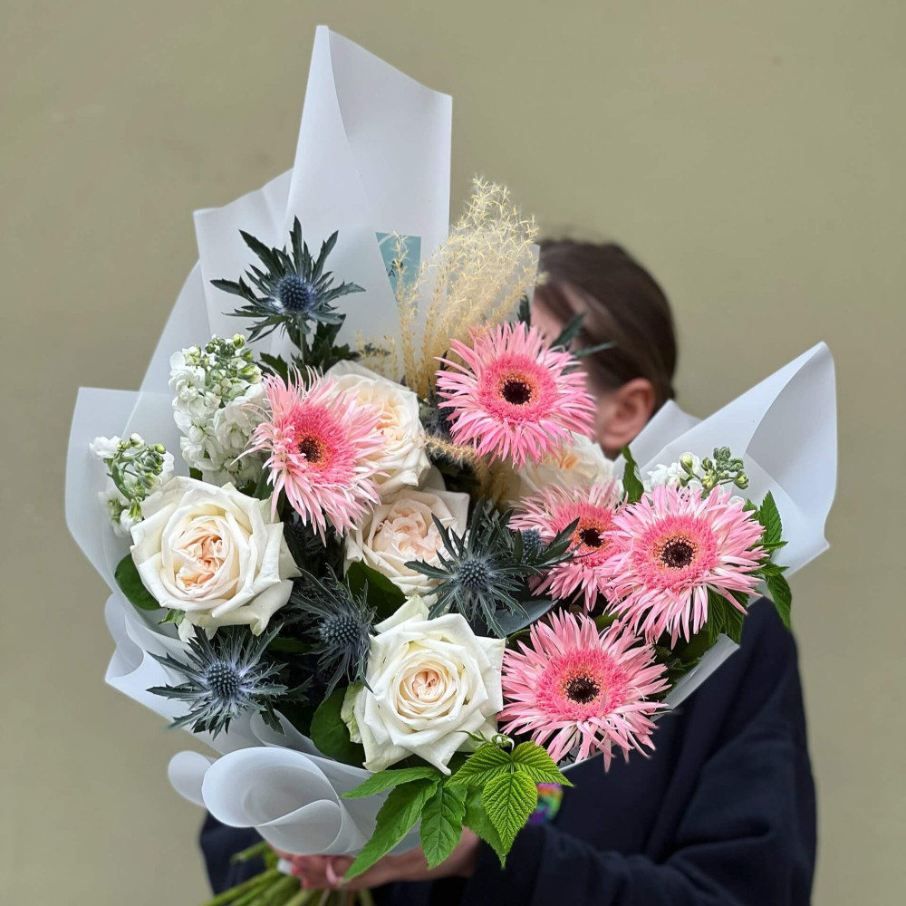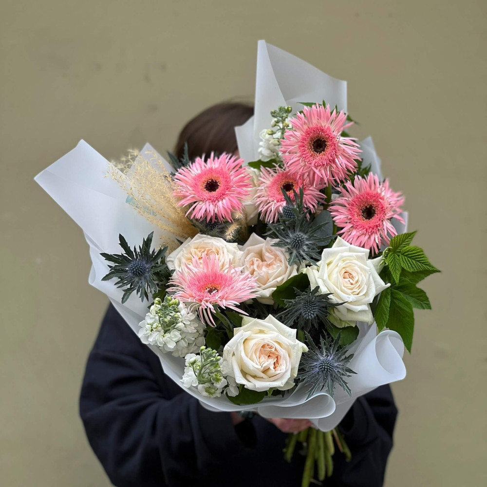 Квіти: Евкаліпт, Ерінгіум, Матіола, Гербера, Троянда піоновидна