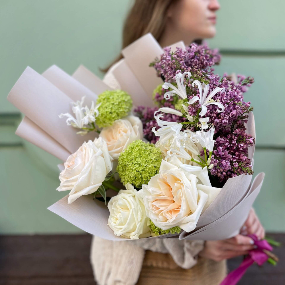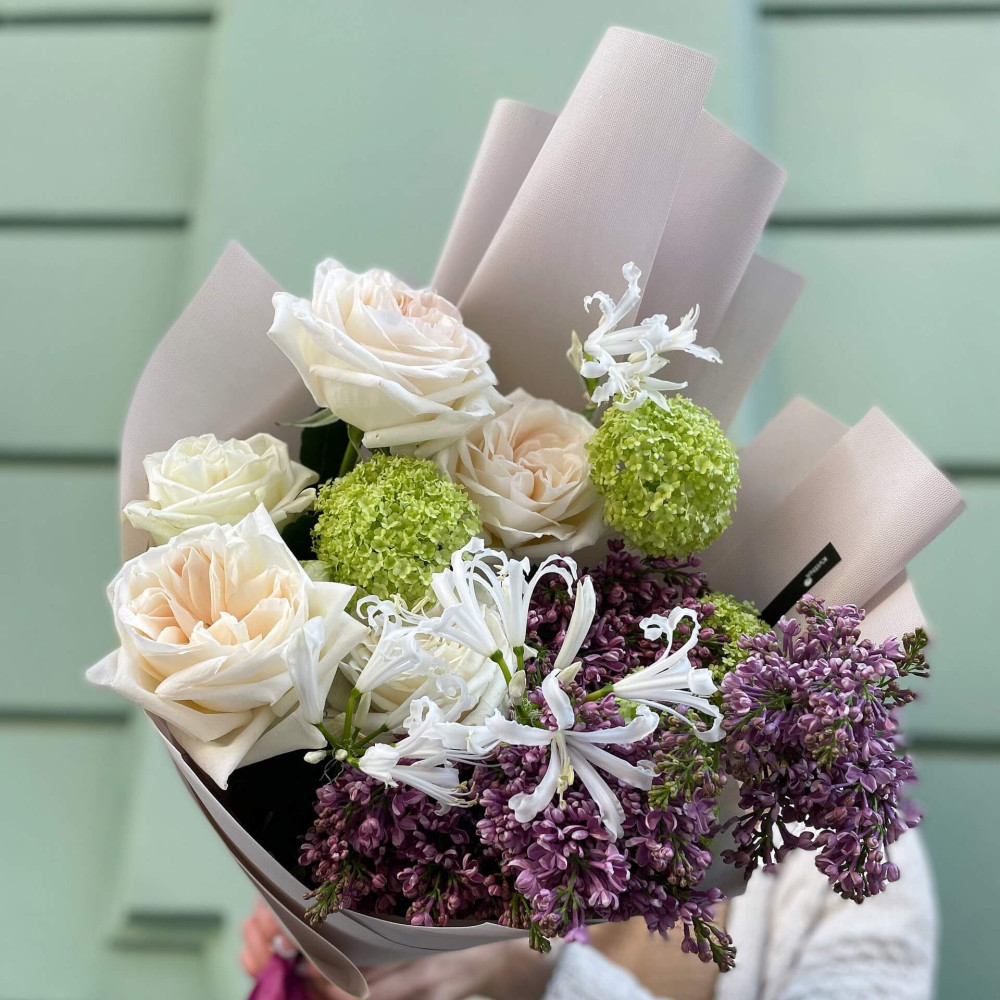 Квіти: Троянда піоновидна, Бузок, Неріне, Вібурнум