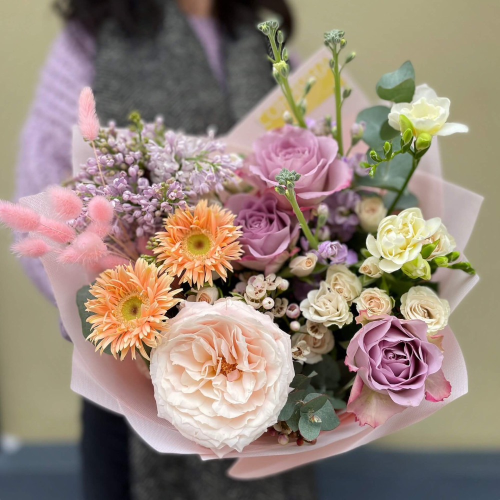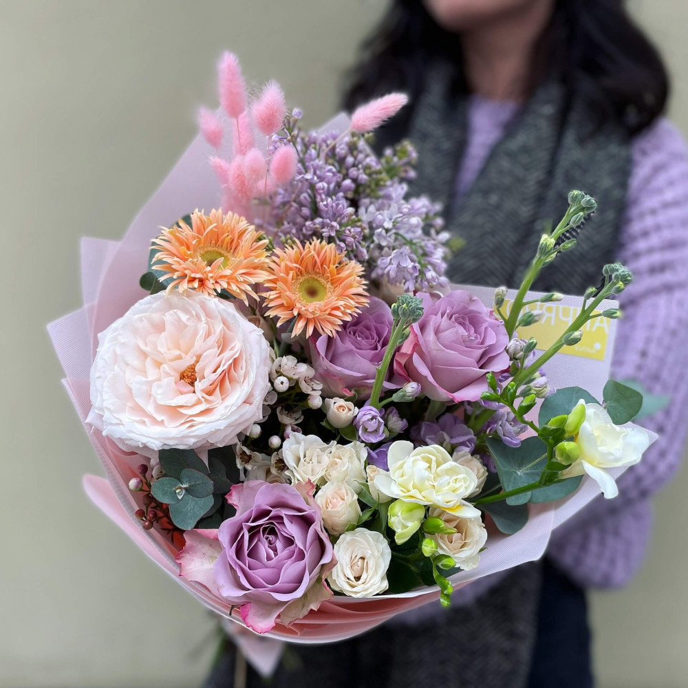 Квіти: Троянда піоновидна, Матіола, Гербера, Бузок, Троянда, Фрезія, Евкаліпт, Лагурус