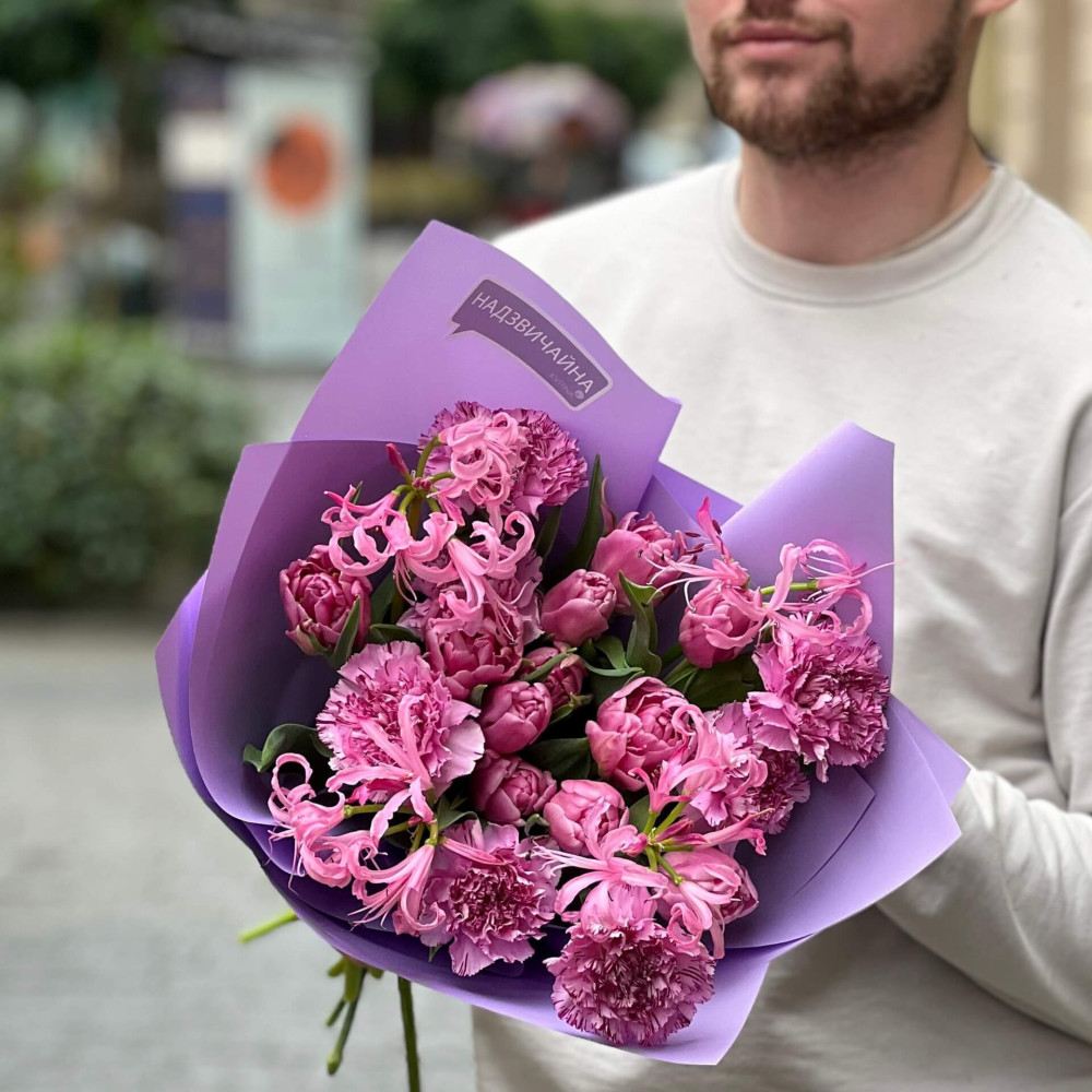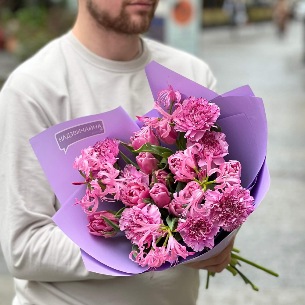 Чудовий весняно-осінній мікс з тюльпанів та неріне та пухнастих шапинок діантусу – живі скарби, які порадують тебе, переливаючись відтінками лавандового, як коштовний камінь на бузковому шовку.