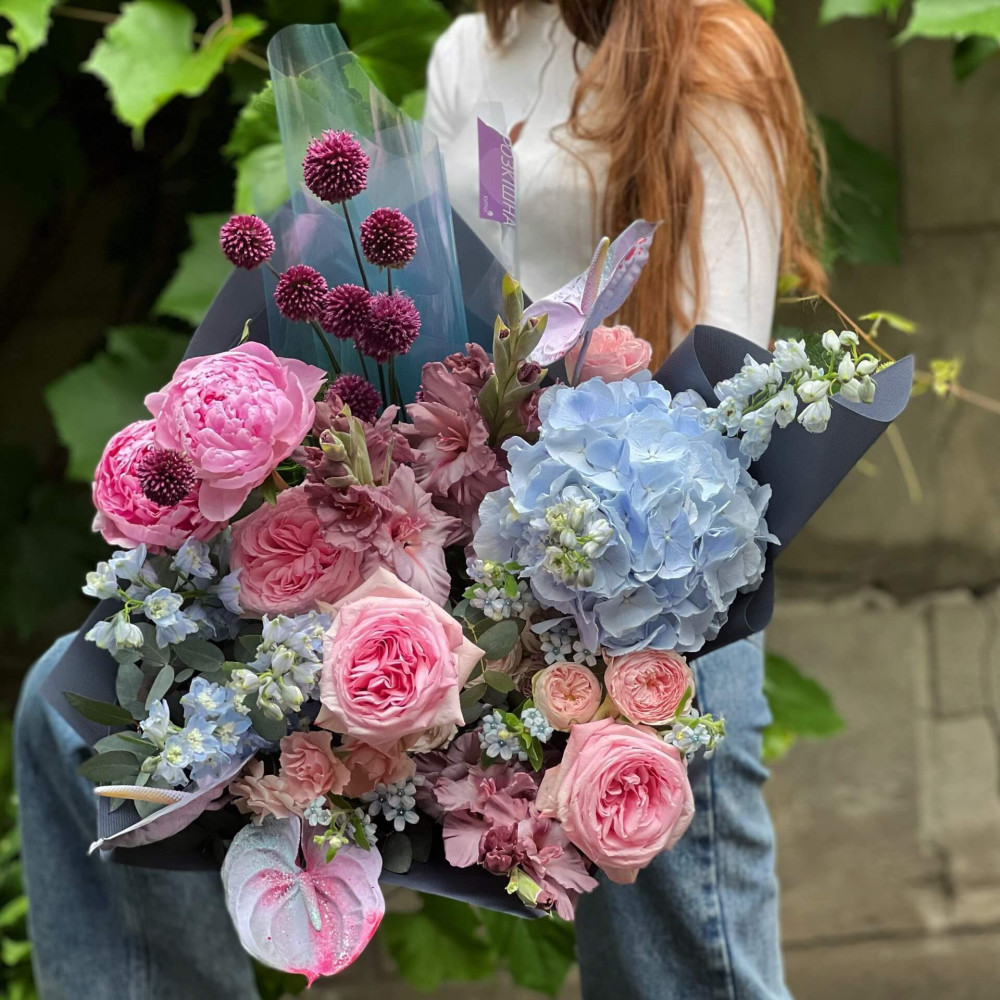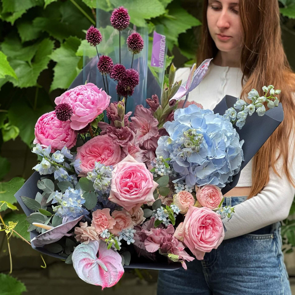 Квіти: Гортензія, Півонія, Троянда піоновидна, Дельфініум, Алліум, Антуріум, Оксіпеталум, Гладіолус