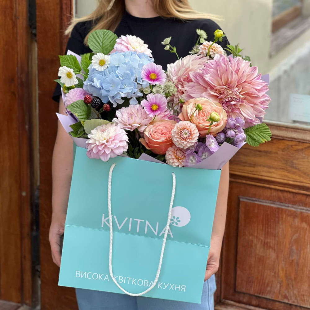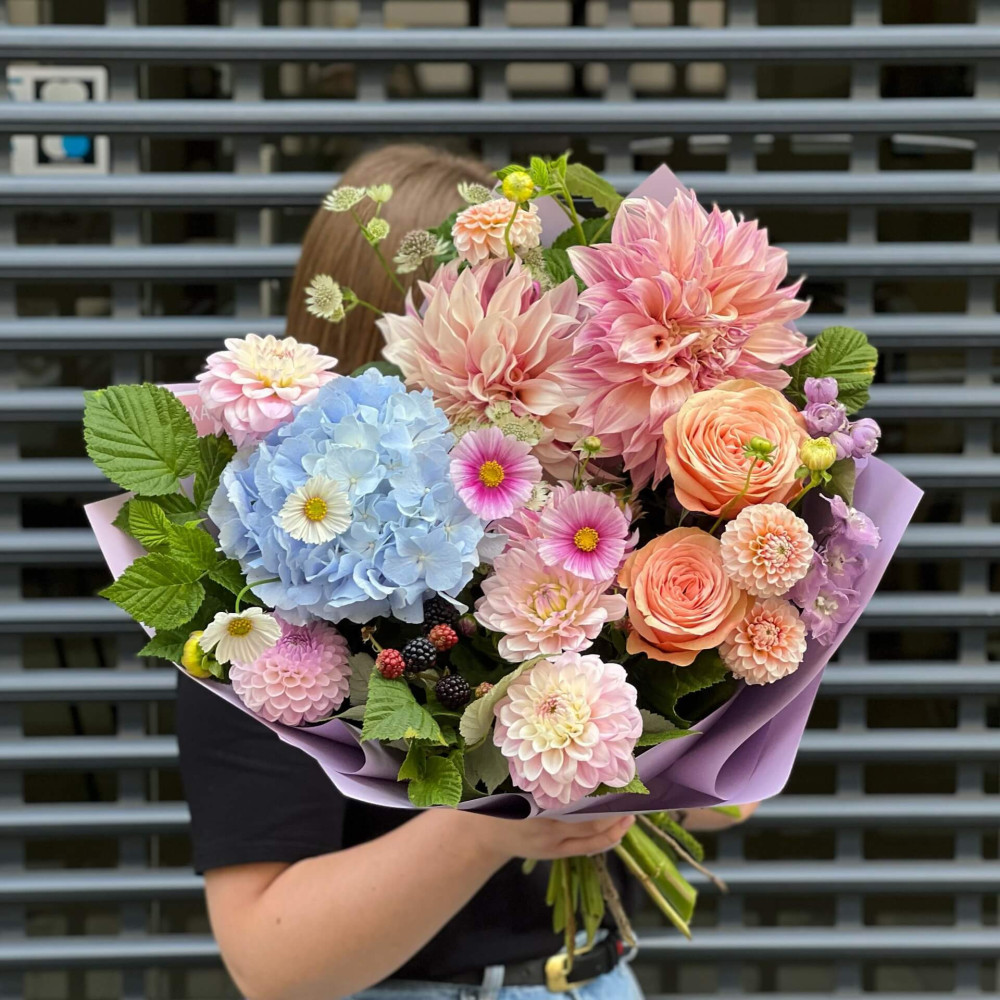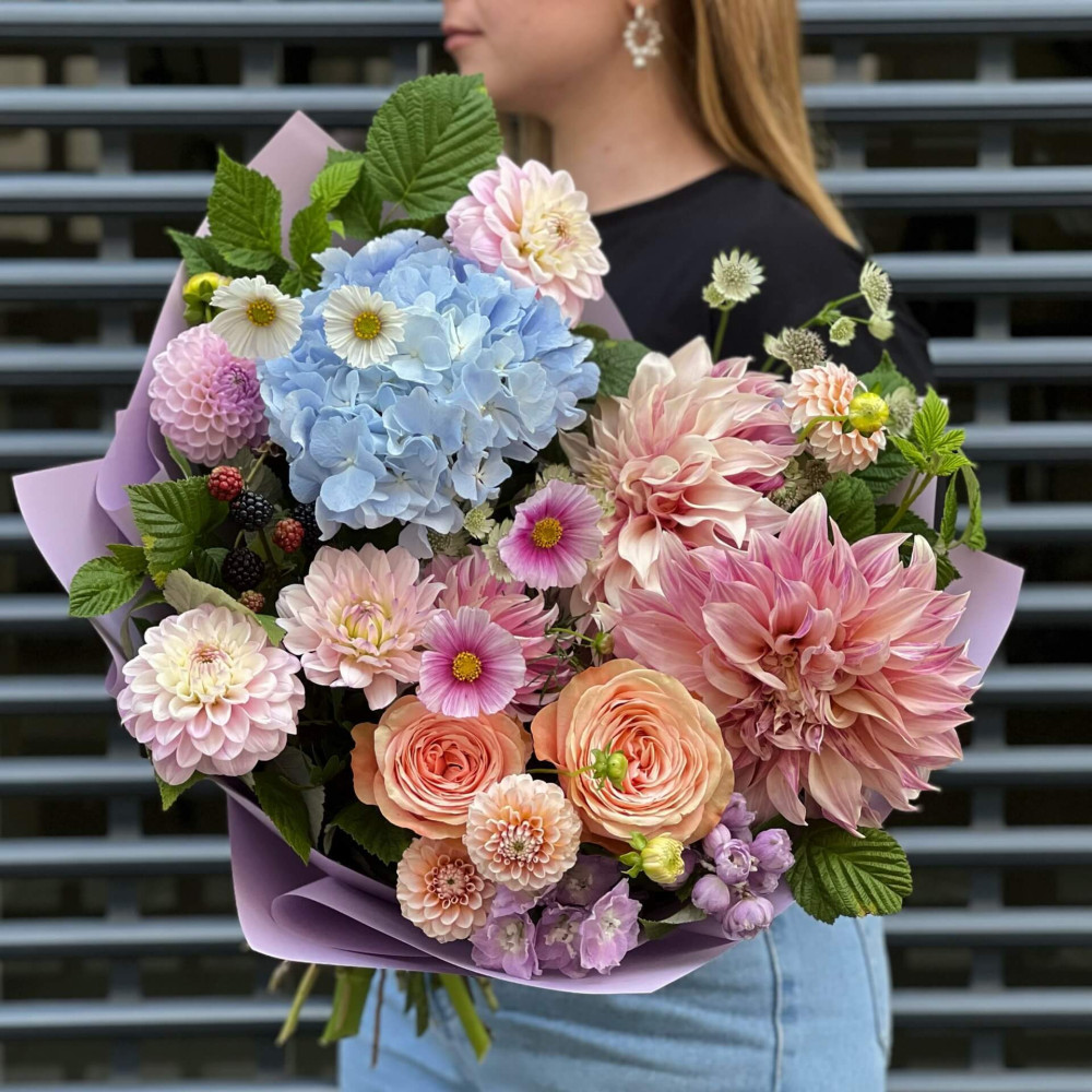 Чудові гортензії та елегантні пишні жоржини – як символ пізнього літа, яке так щедре на цвітіння та свої дари. Букет дихає мрією про літо.