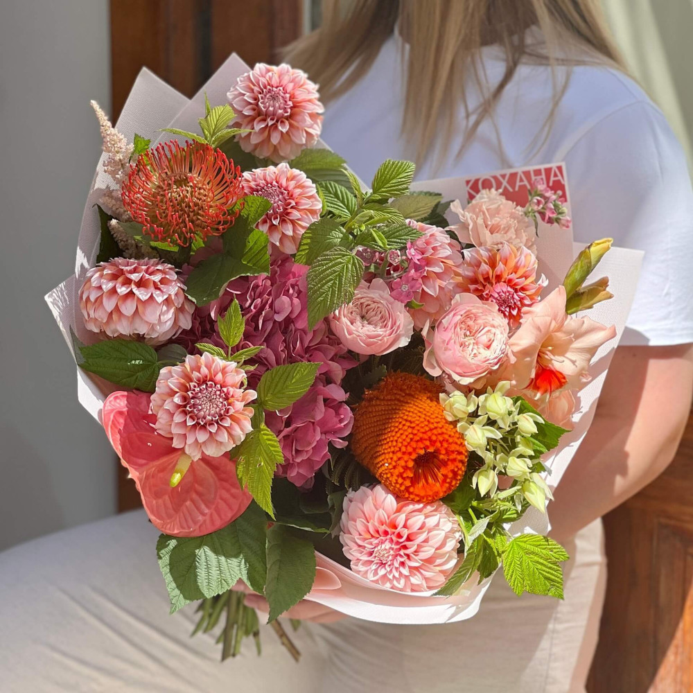 Квіти: Банксія, Антуріум, Гортензія, Жоржина, Серрурія, Леукоспермум, Гладіолус, Оксіпеталум, Астільба, Малина (листя)
