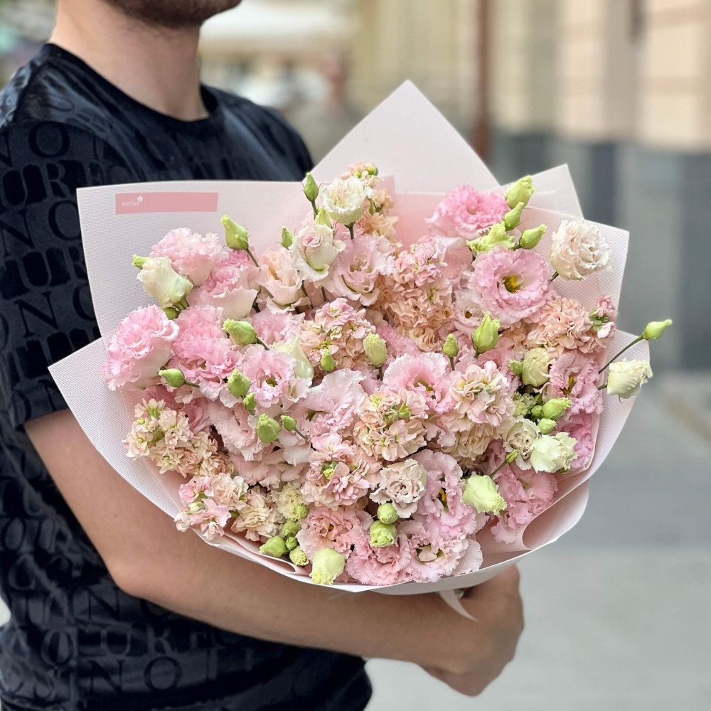 Аромат матіоли та шовкова ніжність еустоми творять разом пухнастий букет з тисячею пелюсточок, немов вишукане мереживо з тисячі завитків.