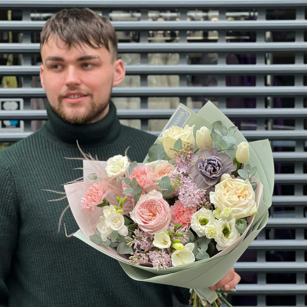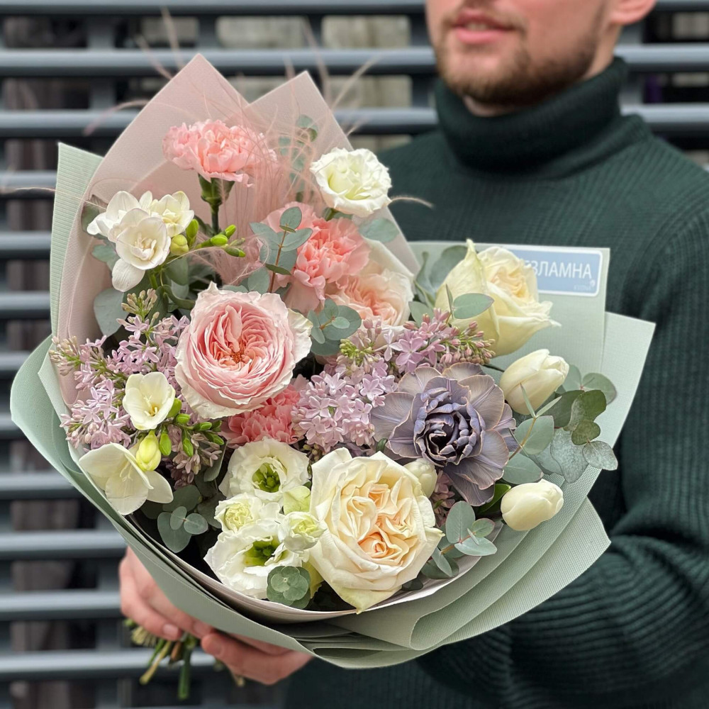 Квіти: Троянда піоновидна, Діантус, Стіфа, Еустома, Тюльпан піоновидний, Бузок, Евкаліпт