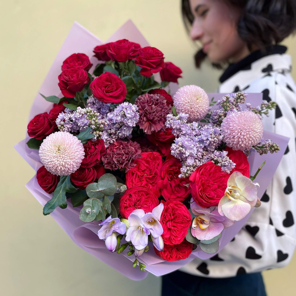 Квіти: Бузок, Троянда піоновидна, Фрезія, Хризантема, Евкаліпт, Діантус