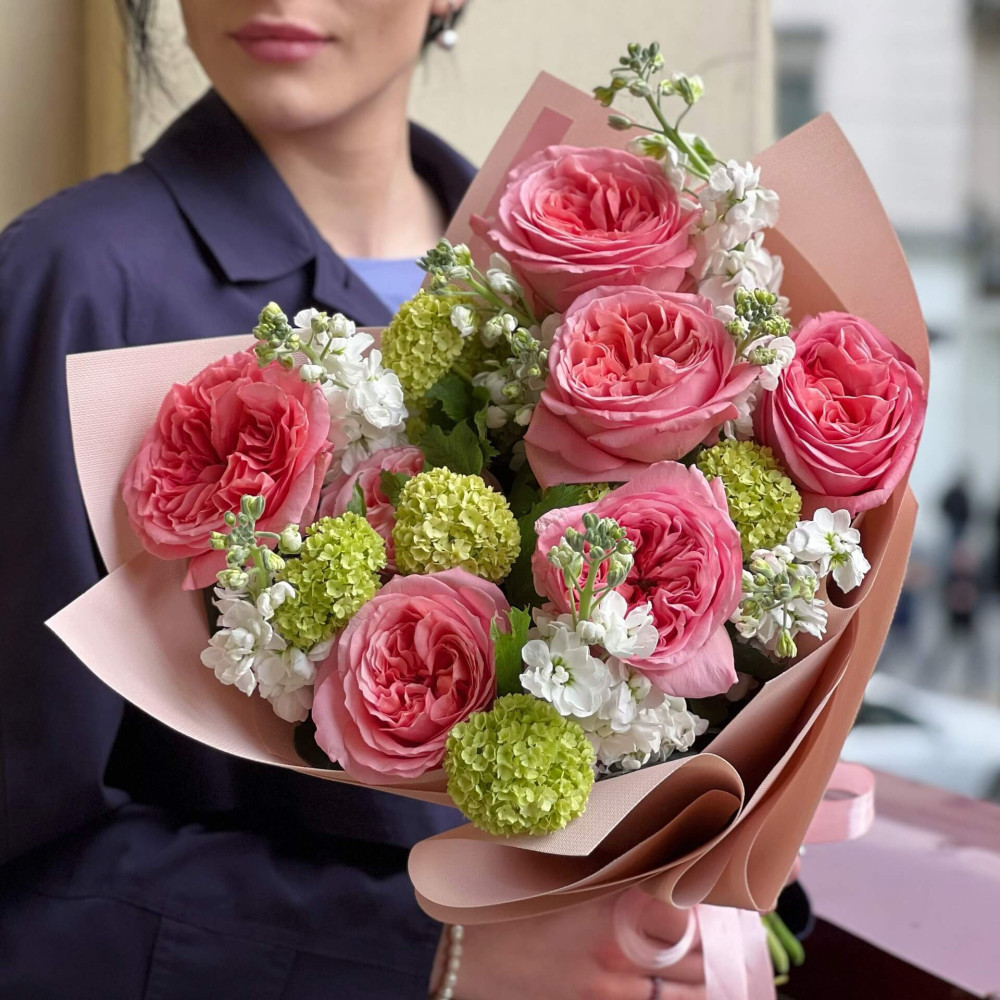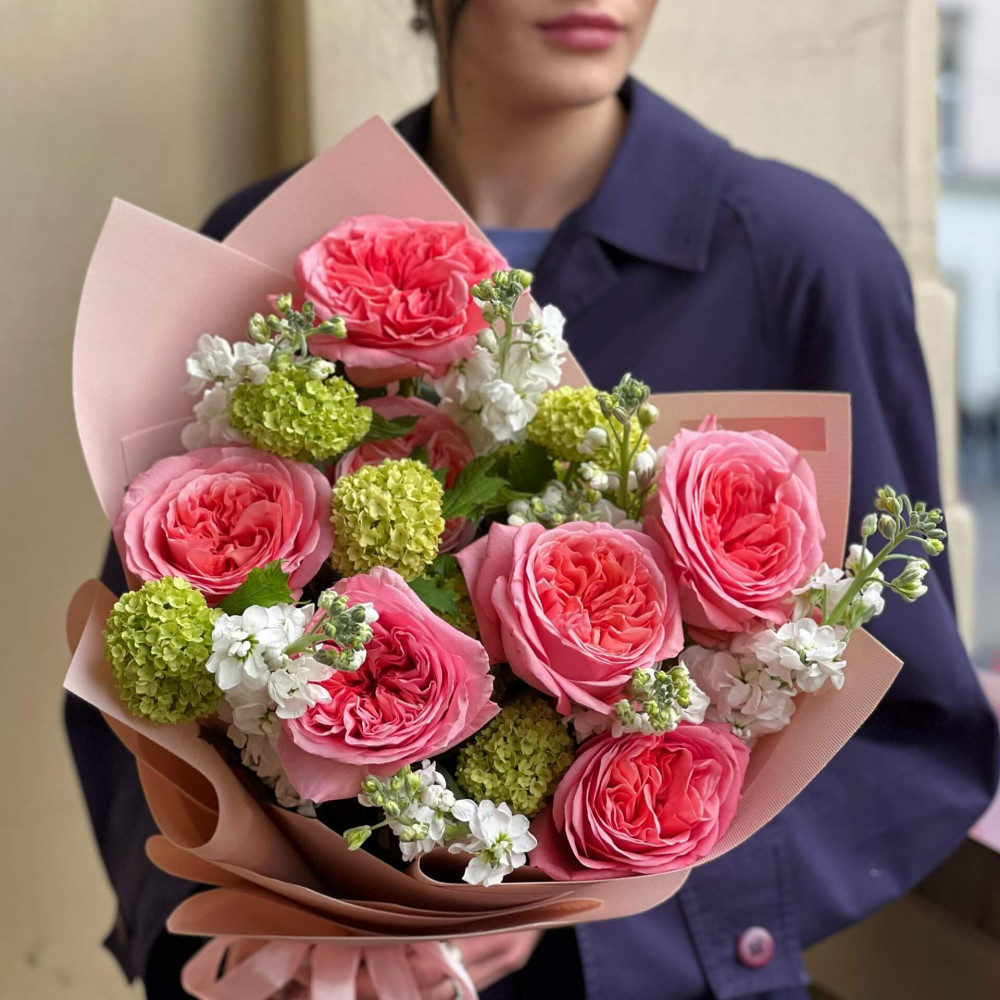 Квіти: Троянда піоновидна, Вібурнум, Матіола