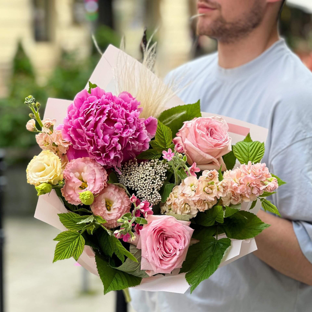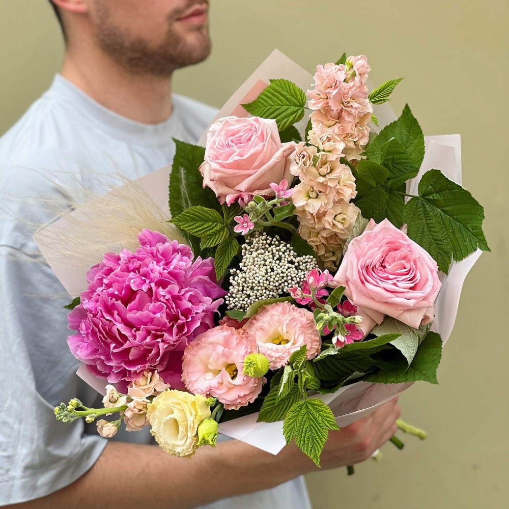 Квіти: Півонія, Матіола, Еустома, Троянда піоновидна, Стіфа, Озотамнус, Оксіпеталум, Малина
