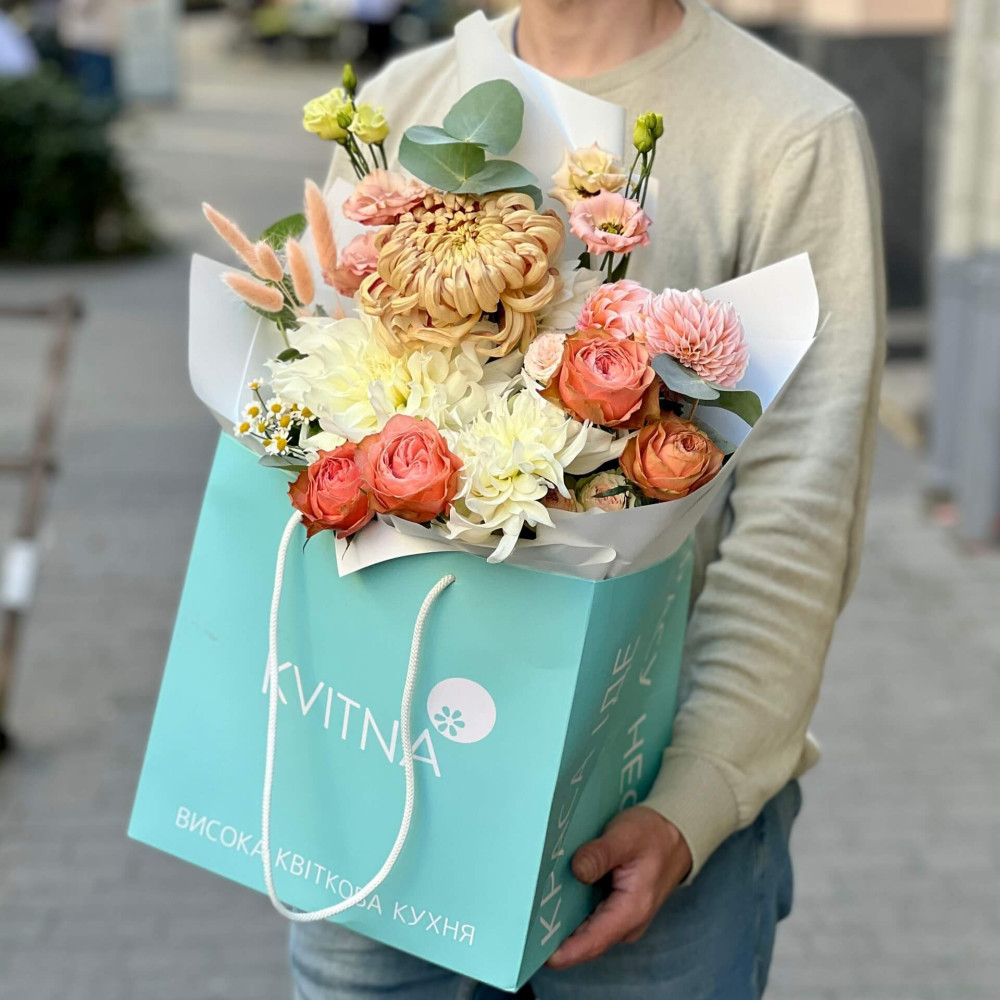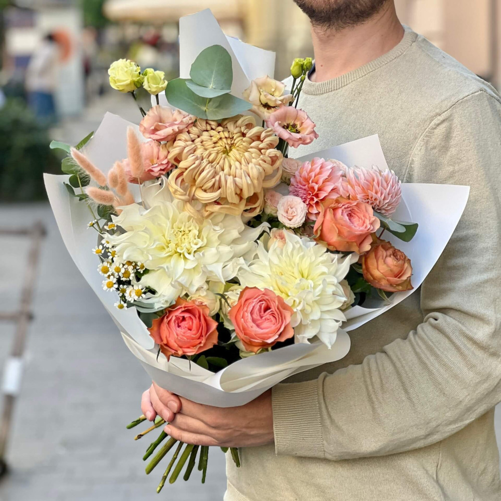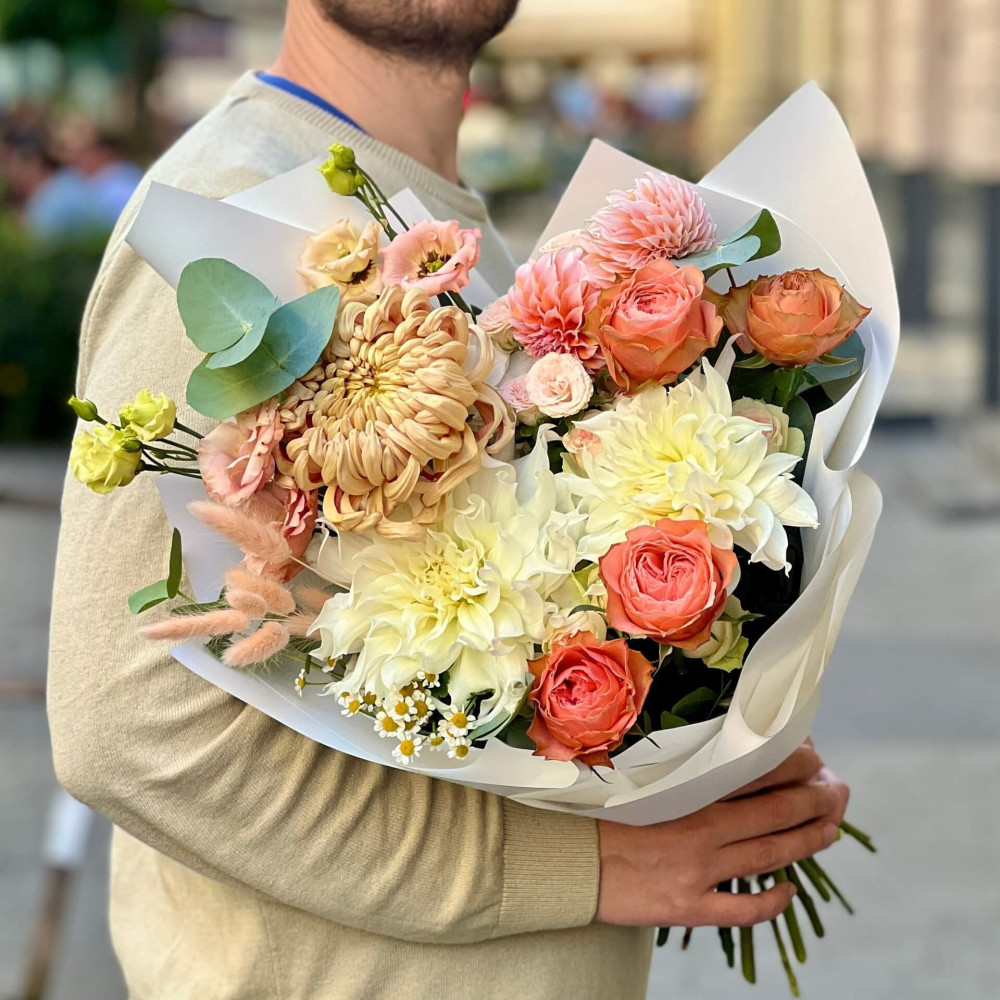 Осінній світлий букет, який нагадує персиковий йогурт – такий же солодкий, запашний та з персиковими часточками на білому тлі. Смакота, яка тішитиме не кілька хвилин, а кілька днів.