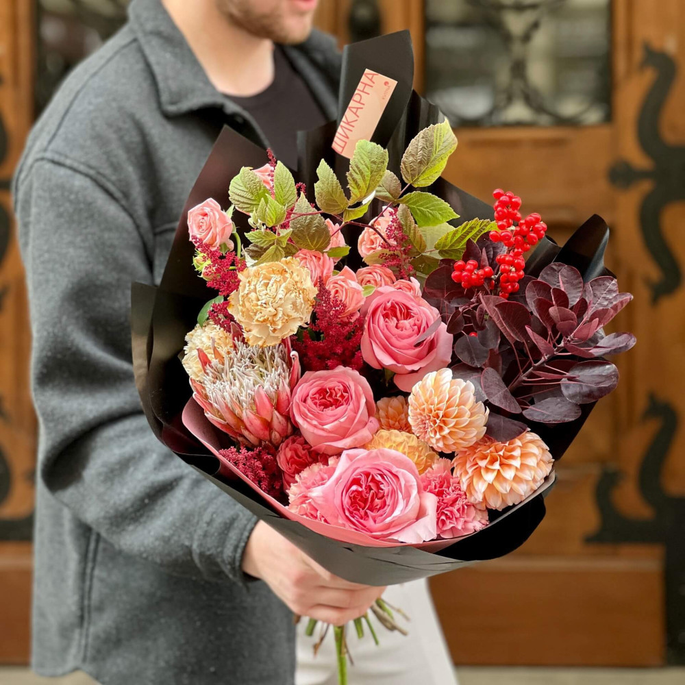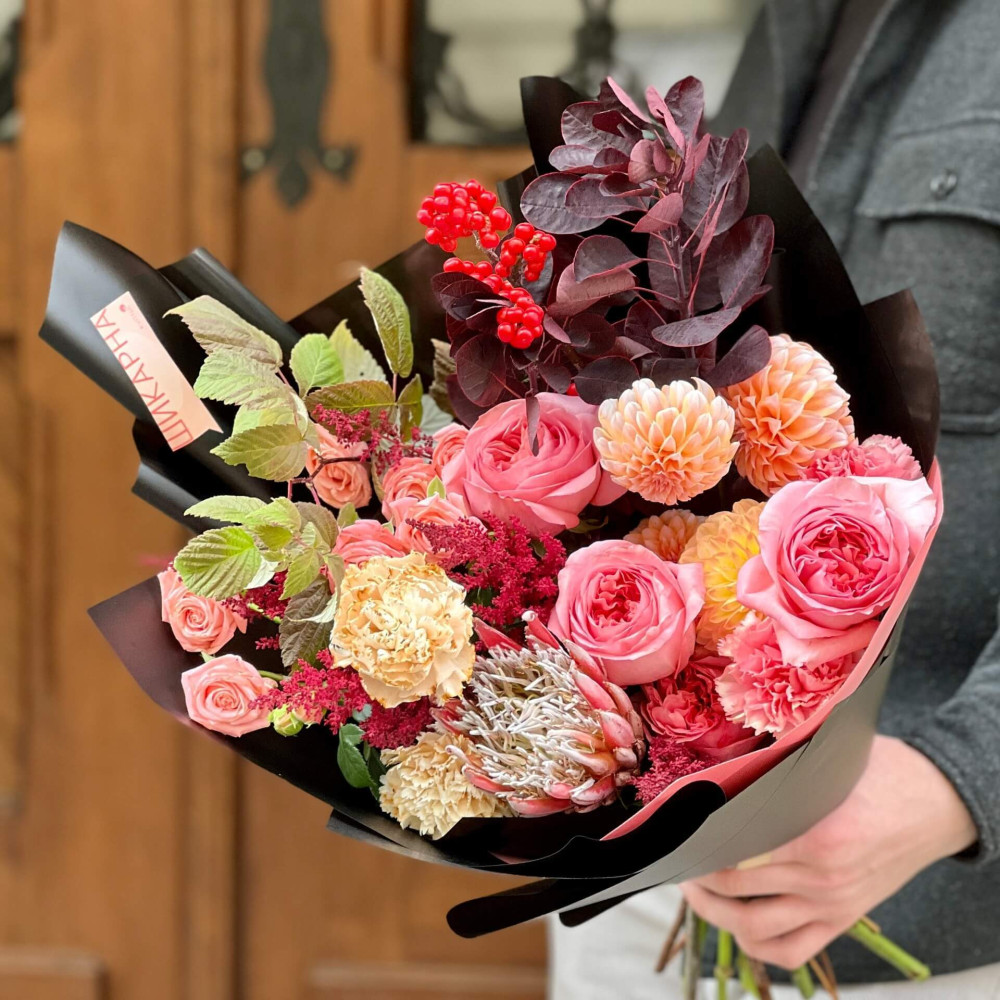 Квіти: Троянда піоновидна, Протея, Діантус, Жоржина, Ілекс, Котінус, Астільба