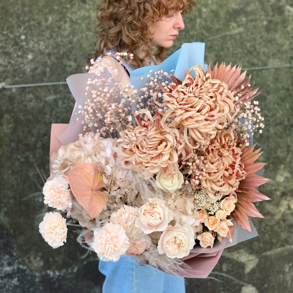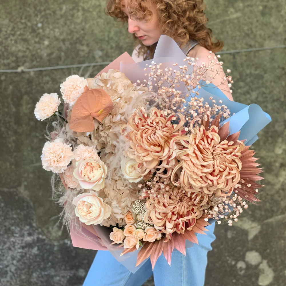 Квіти: Гортензія, Хризантема, Гіпсофіла, Діантус, Троянда піоновидна, Стіфа, Озотамнус, Троянда кущова
