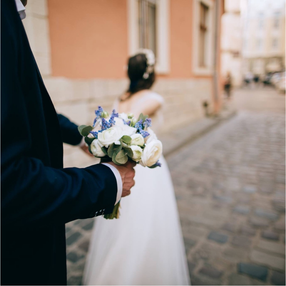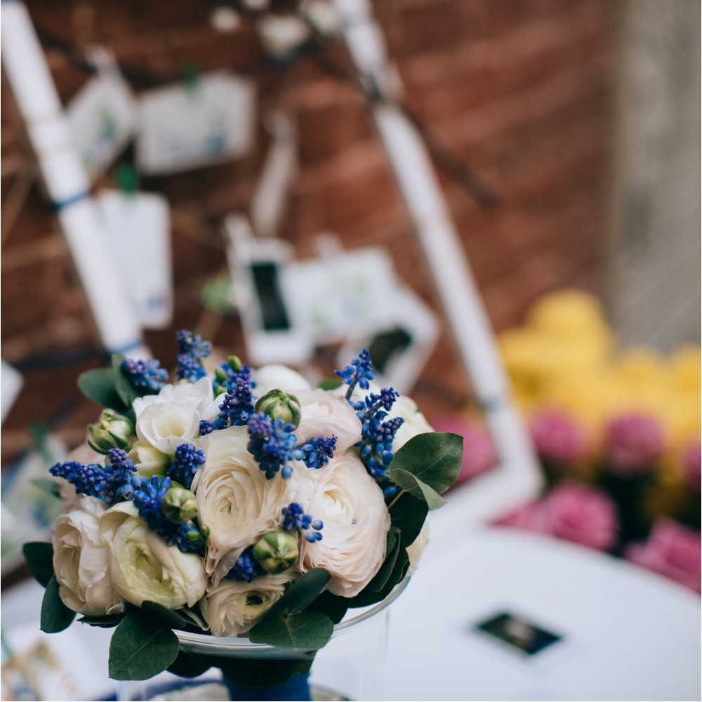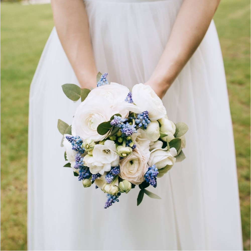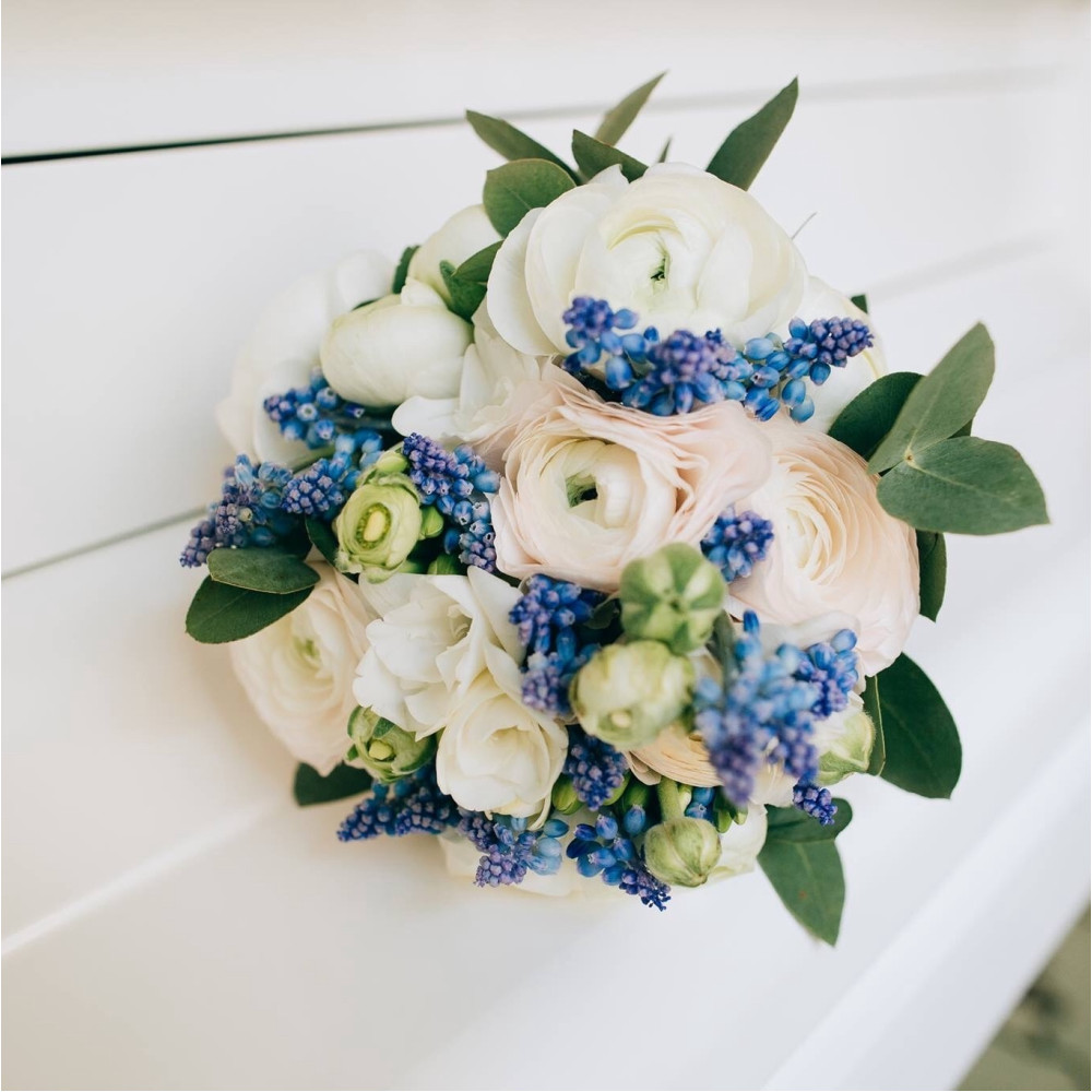 Біло-синій весняний весільний букет з ранункулюсів та мускарі