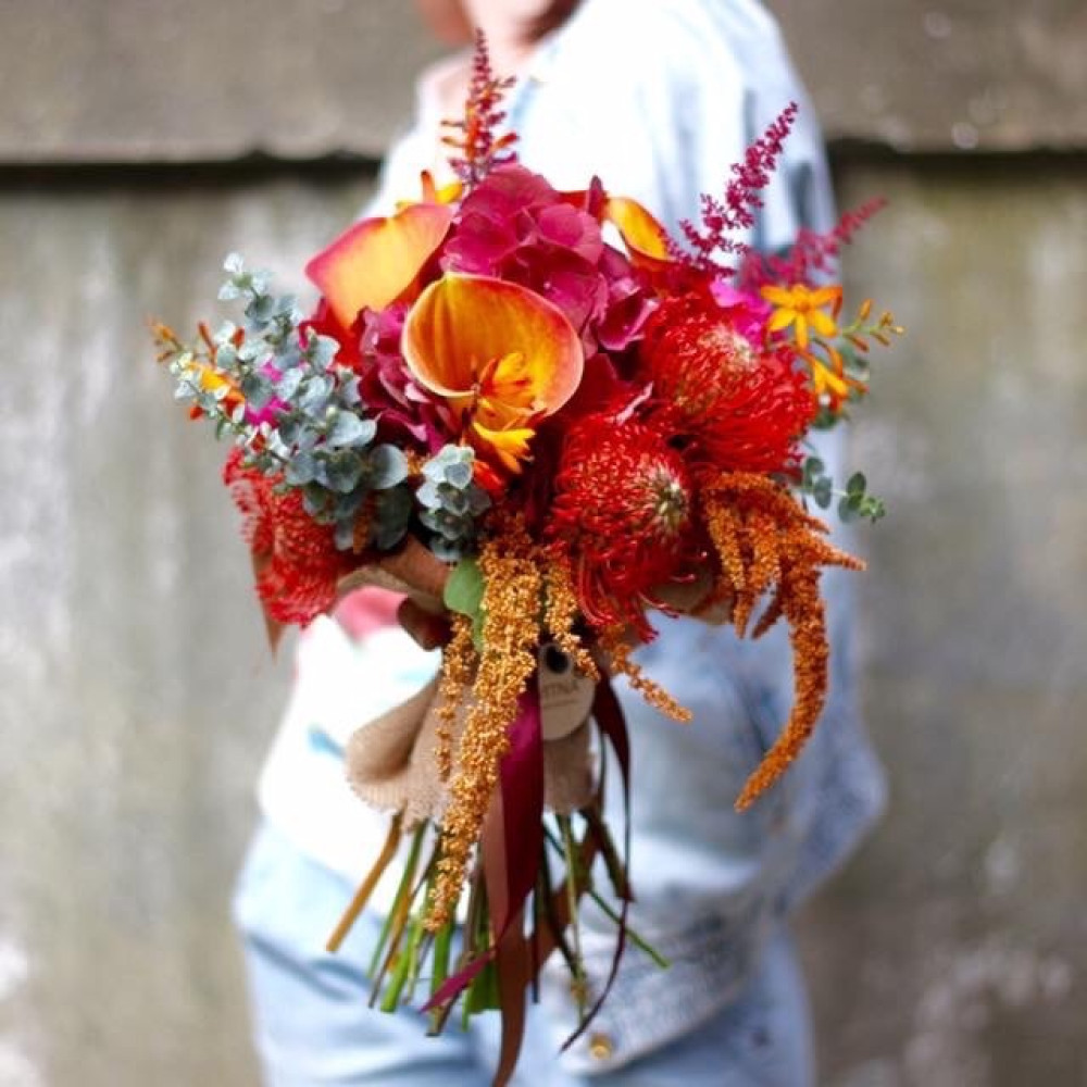 Яскравий, насичений сонячними проміннями букет для привітання молодят з днем весілля