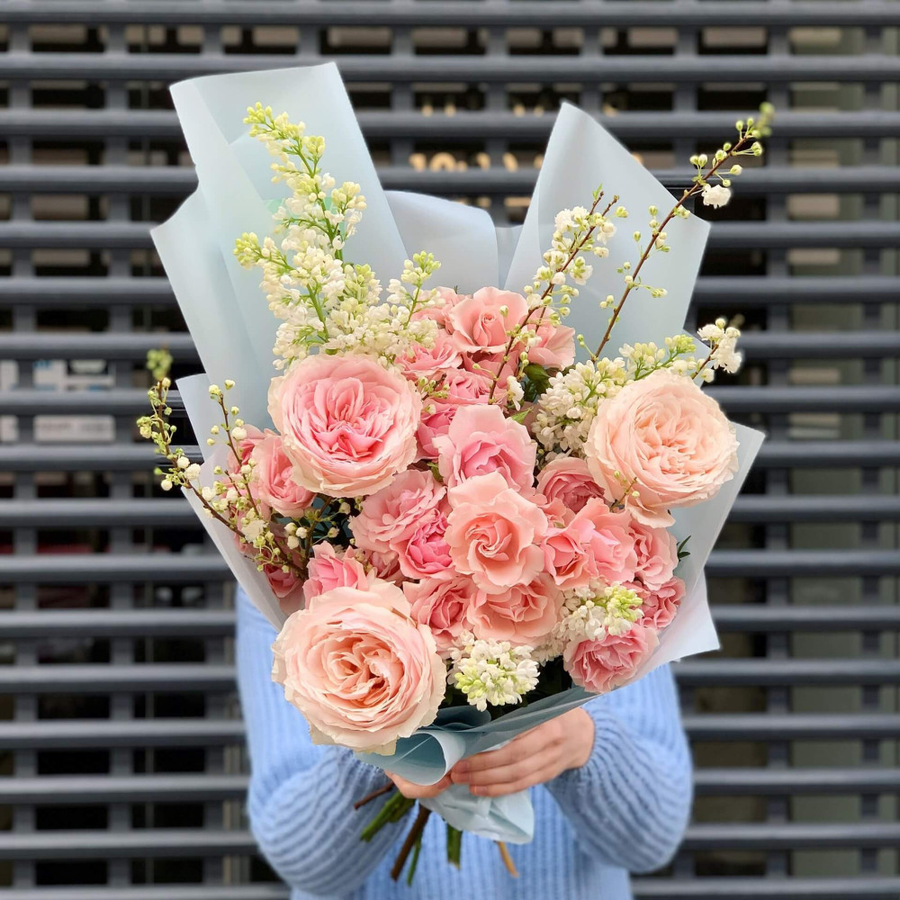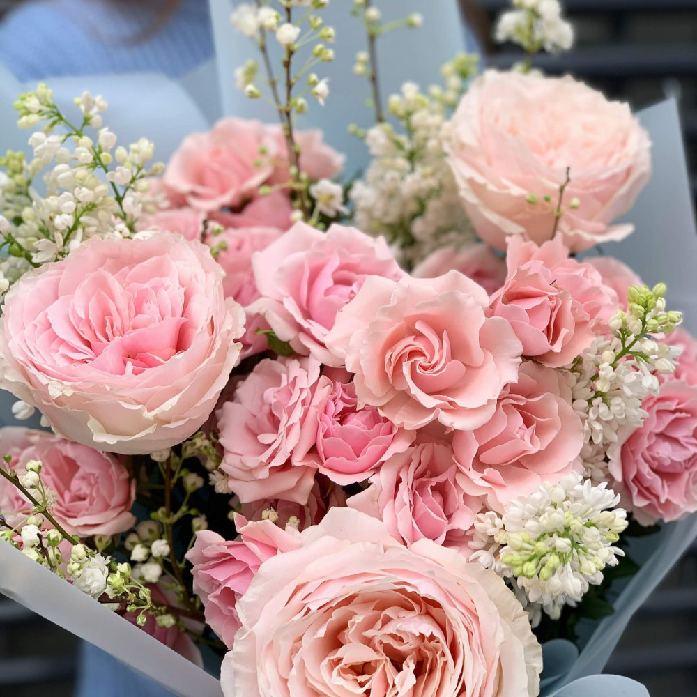 Квіти: Троянда піоновидна, Троянда кущова, Бузок