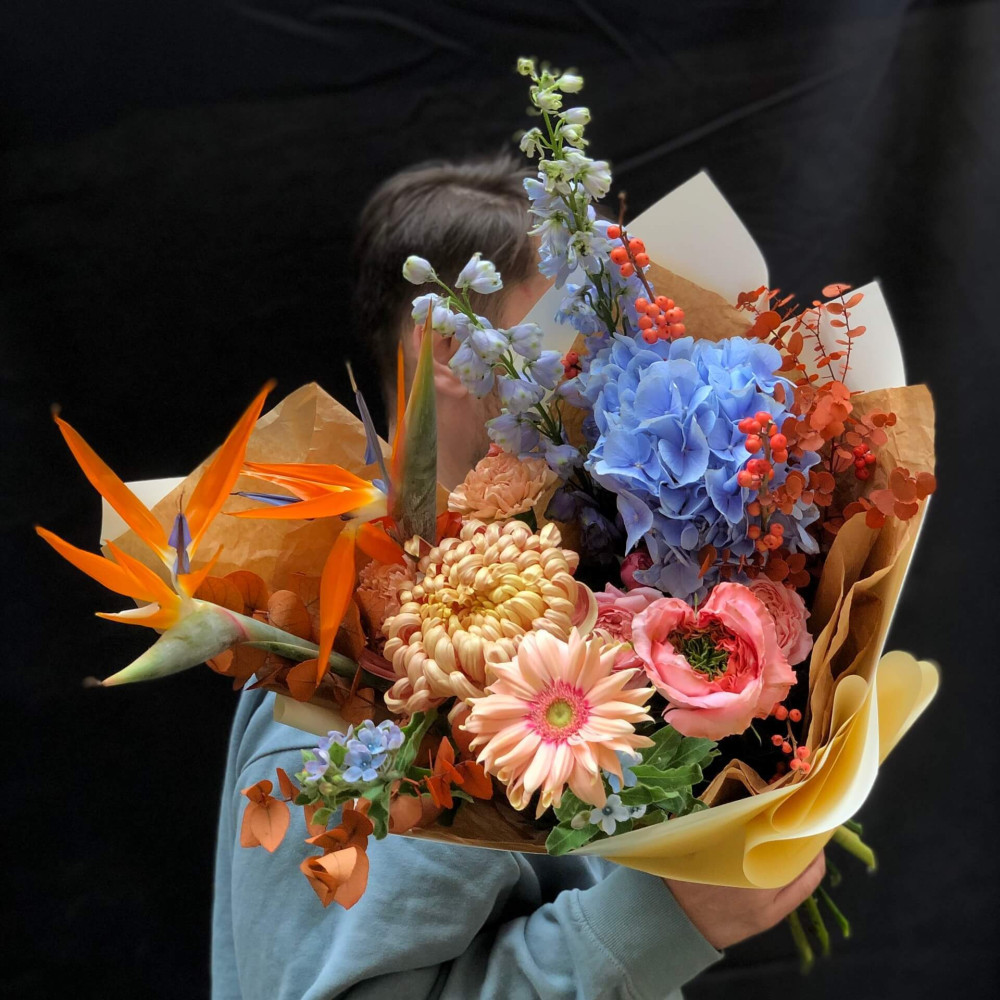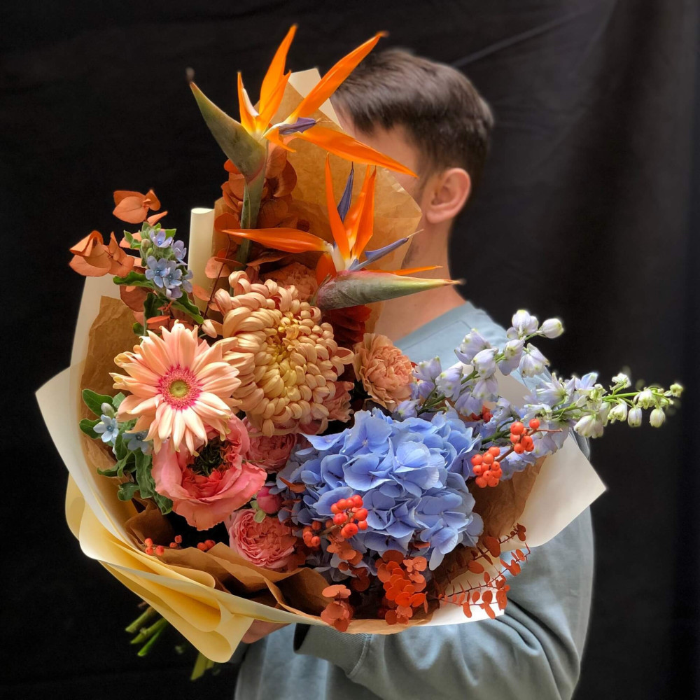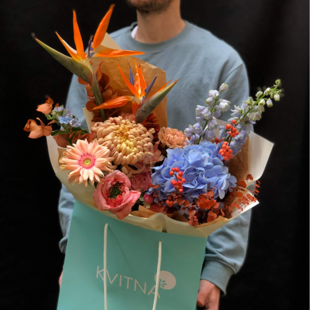 Квіти: Стреліція, Хризантема, Оксіпеталум, Гортензія, Троянда піоновидна, Гербера, Діантус (Гвоздика), Евкаліпт, Ілекс