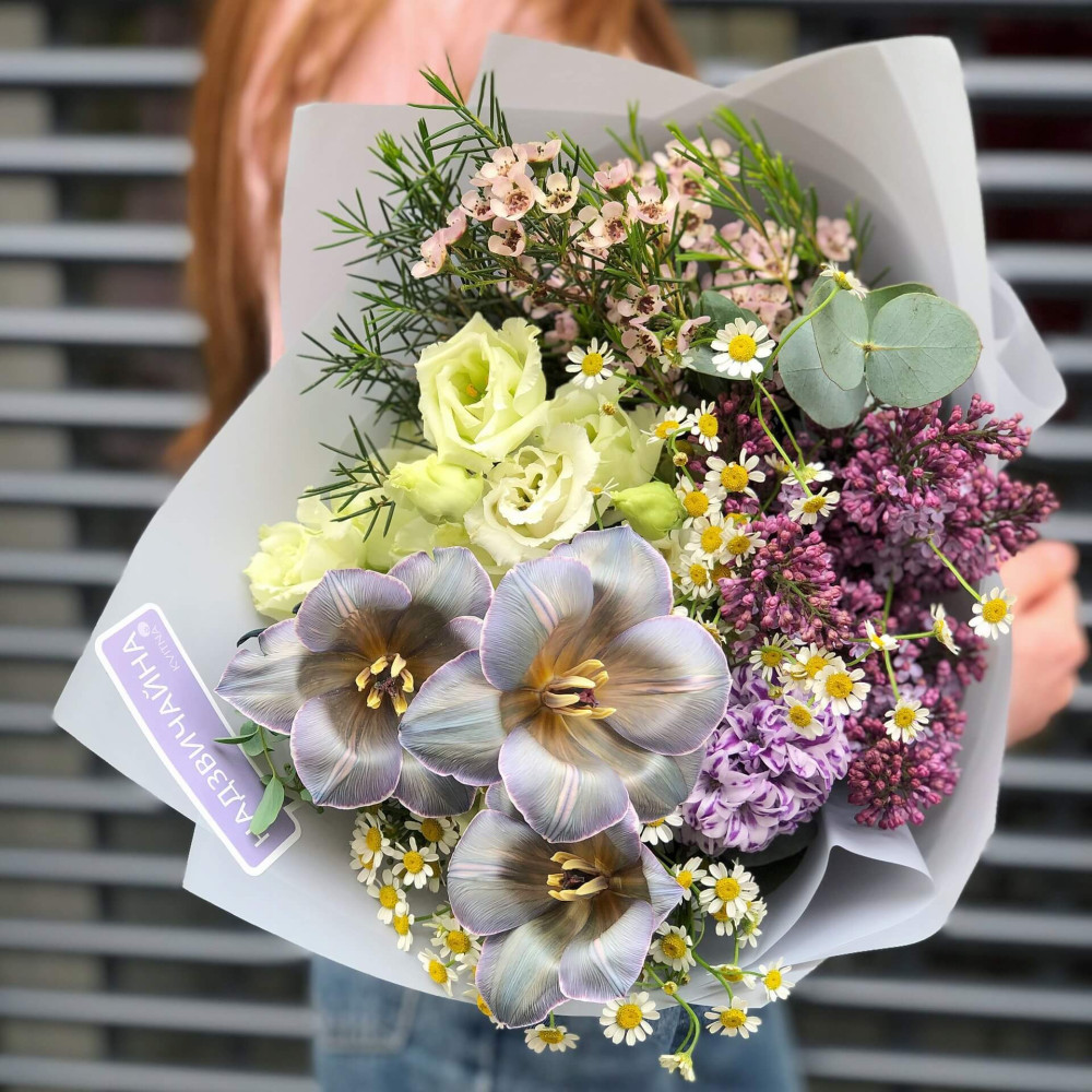 Квіти: Тюльпан, Хамелаціум, Еустома, Евкаліпт, Бузок, Танацетум, Гіацинт