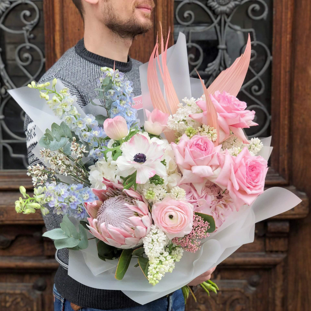Квіти: Протея, Дельфініум, Анемон, Троянда піоновидна, Бузок, Ранункулюс, Евкаліпт