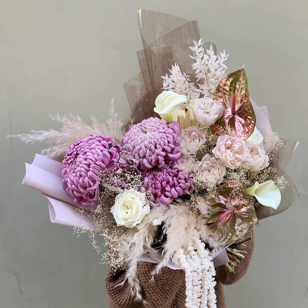 Квіти: Зантедескія, Гіпсофіла, Троянда, Кортадерія, Антуріум, Хризантема, Троянда піоновидна