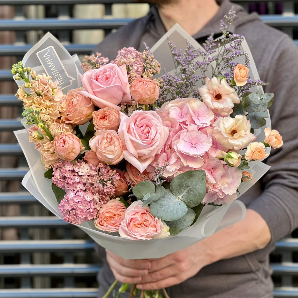 Квіти: Матіола, Троянда кущова, Троянда, Ранункулюс, Бузок, Діантус, Кермек, Евкаліпт