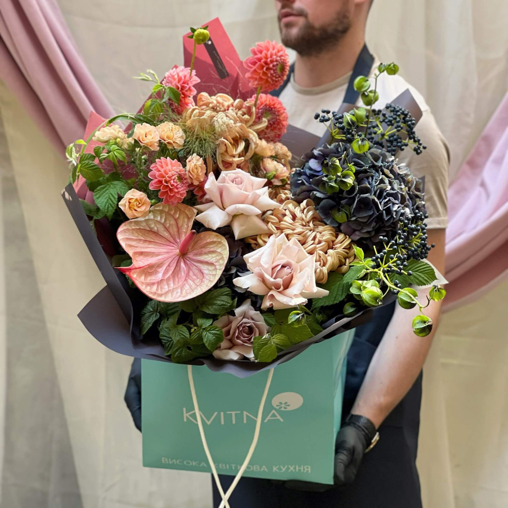 І це, до речі, зовсім не обов'язково плюси, це особливості, які потрібно розуміти. Тоді і вибір «де купити букет у Львові» зробити буде значно простіше.- Кожен букет Kvitna унікальний. Це означає, якщо Ви замовите у нас якийсь із букетів на сайті, то Ви не отримаєте точнісінько такий же. Деяких це бентежить, такі люди не хочуть «ризикувати», бажають «в точності, як на світлині». У «Квітна» кожен букет — це творчий пошук, це захоплення, злиття з квітами, образом одержувача і завданням. Так, ми можемо прийняти за вектор, зробити схожий букет, в тому ж стилі, кольоровій гамі, з тих самих квітів ... Але нам нудно робити за шаблоном. Адже букет, представлений на зображенні, робився для іншої людини, з іншого приводу, під інший настрій і натхнення. У Вас буде все по-іншому.
