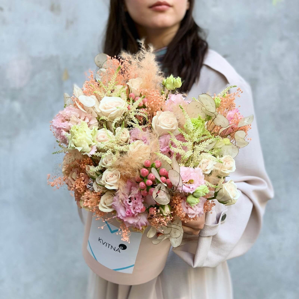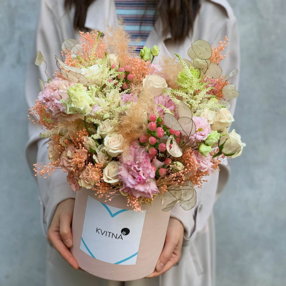 Нехай композиція (коробка, кошик, сніп) з квітами від Квітна тішить Вас якнайдовше!