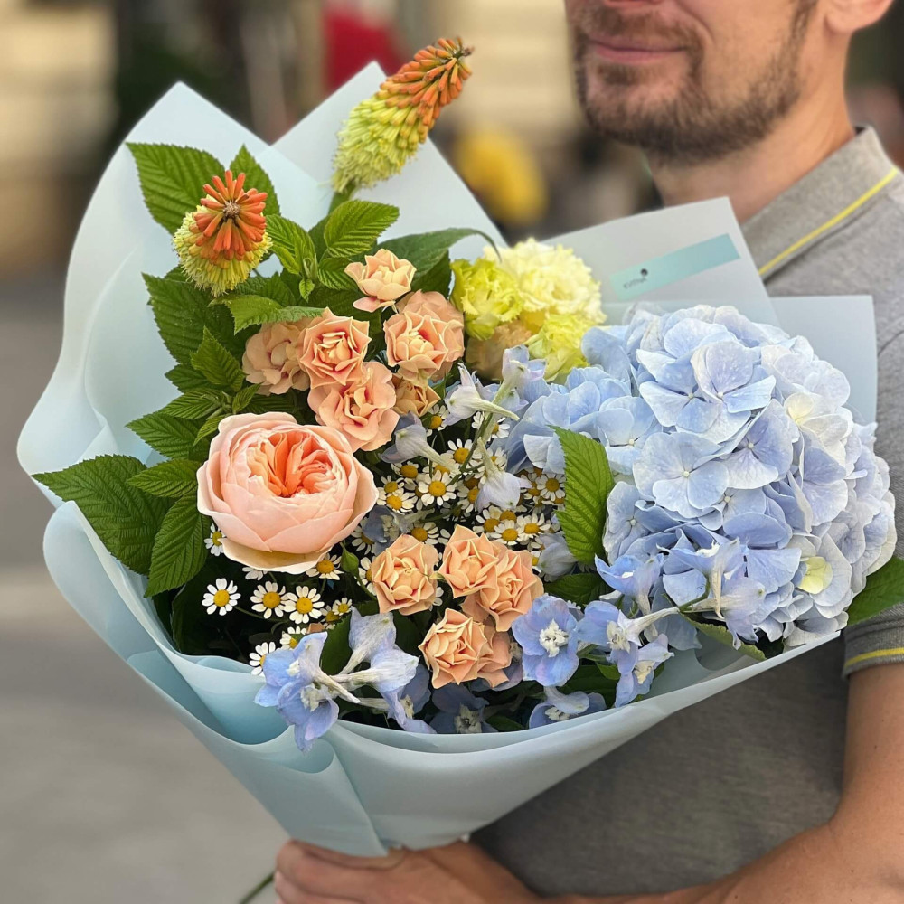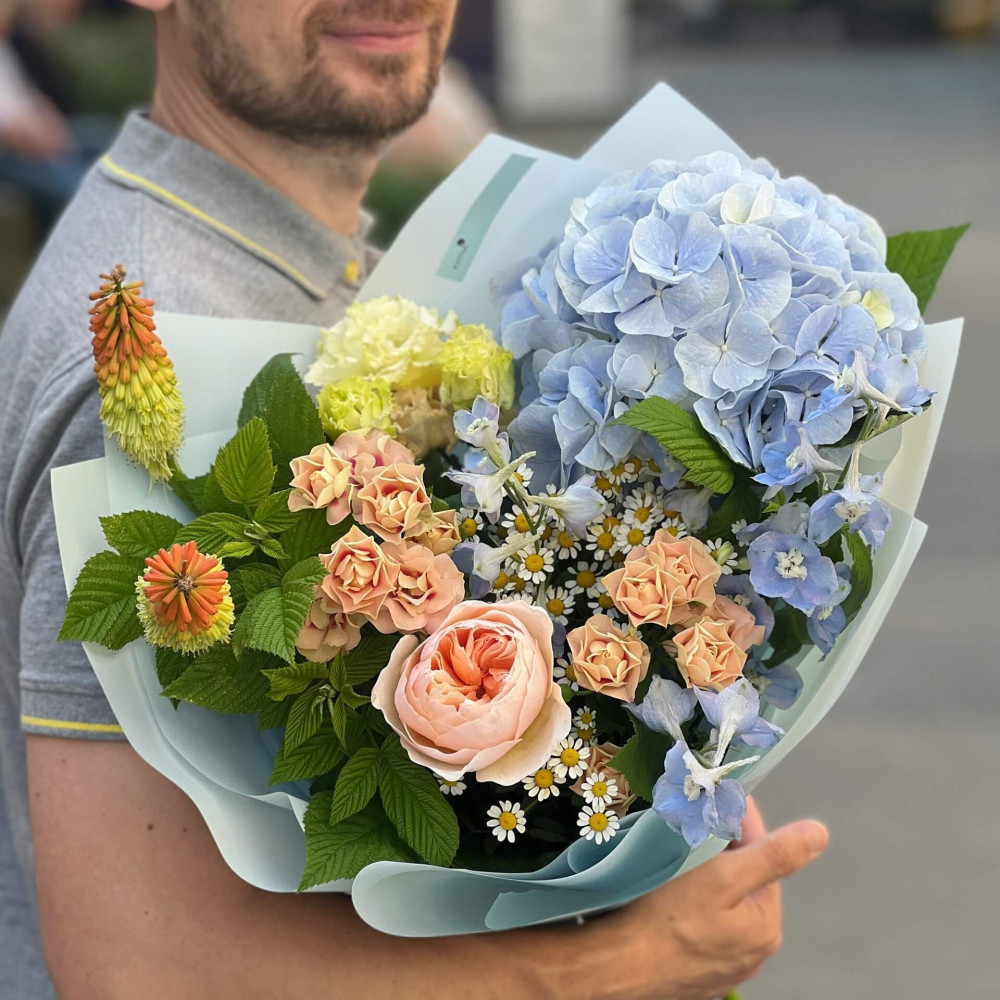 Квіти: Гортензія, Троянда піоновидна, Кніфофія, Троянда кущова, Танацетум, Еустома, Дельфініум, Малина