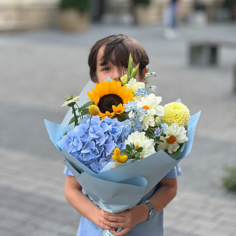 Рідні кольори об'єднані в цьому легкому та світлому букеті, який подарує тобі сяйливий та радісний настрій. Небо подарувало тобі часточку себе у вигляді синьої гортензії, а ми вже додали трішки сонечка та пухнастих білих хмарок.