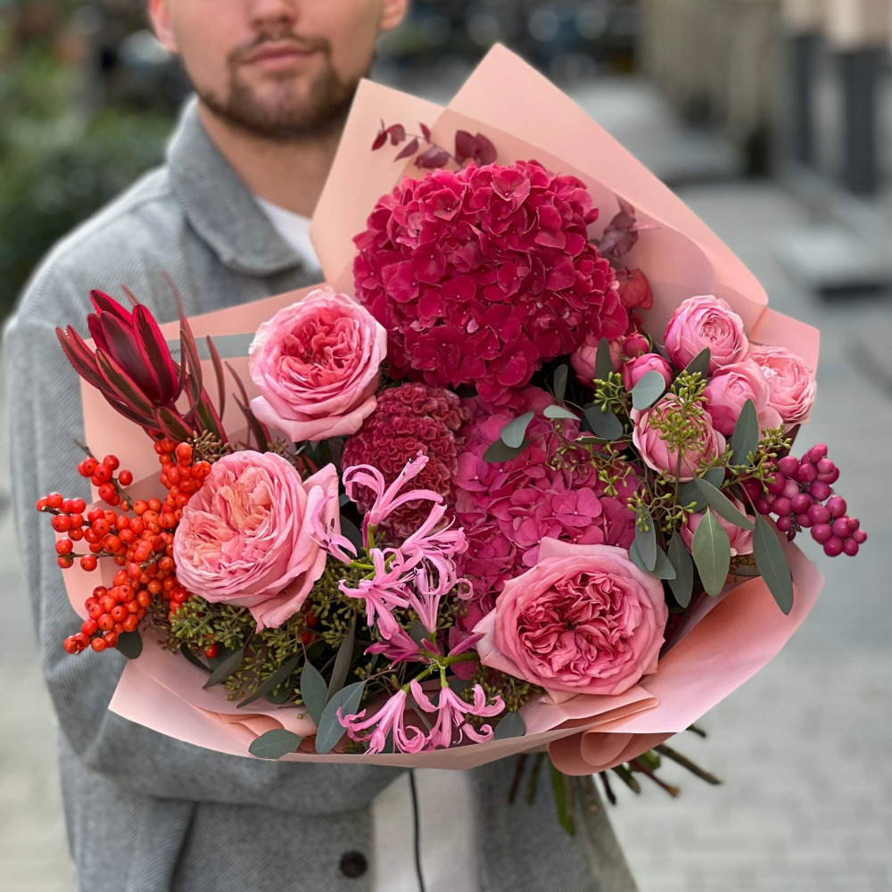 Квіти: Гортензія, Троянда піоновидна, Ілекс, Евкаліпт, Леукадендрон, Неріне, Сімфорікарпус, Целозія