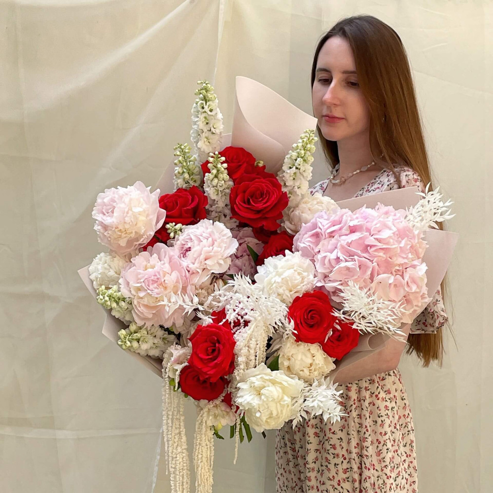 Квіти: Півонія, Троянда, Дельфініум, Гортензія, Рускус, Амарант хвостатий