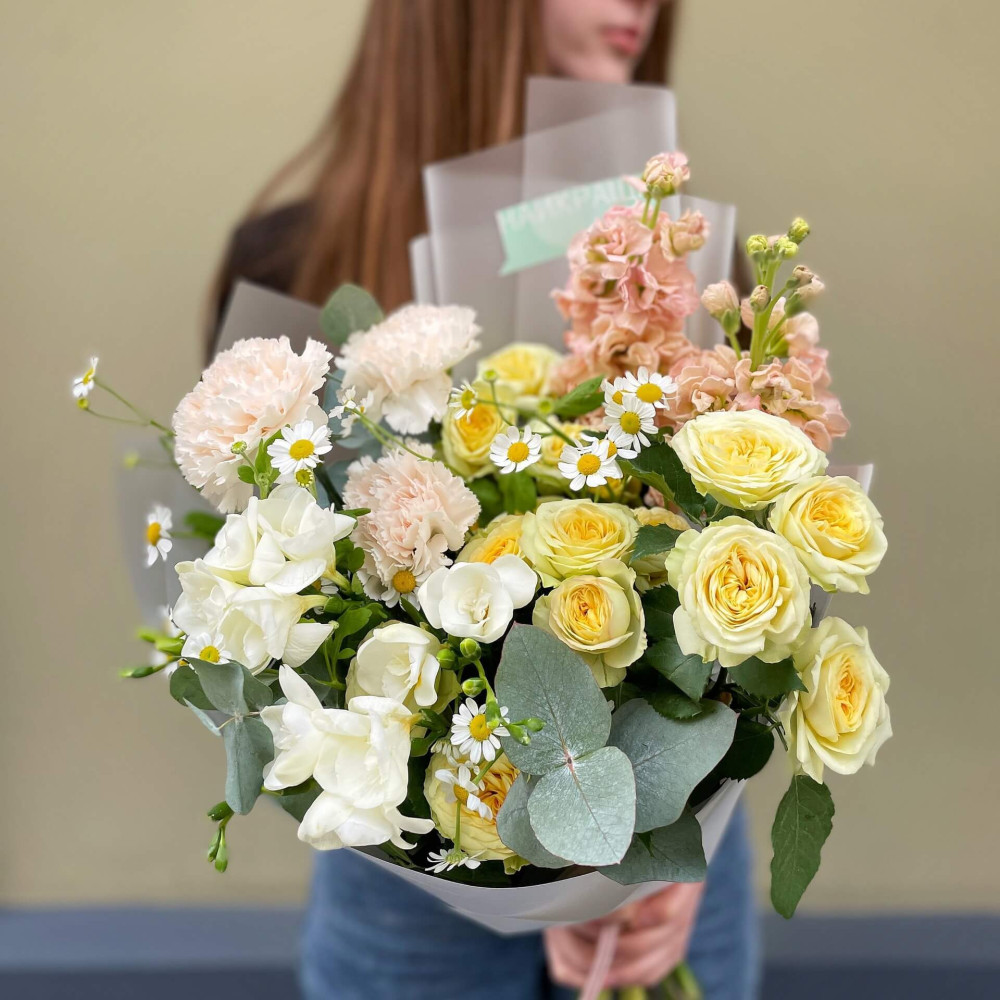 Квіти: Троянда кущова, Матіола, Діантус, Евкаліпт, Танацетум, Фрезія
