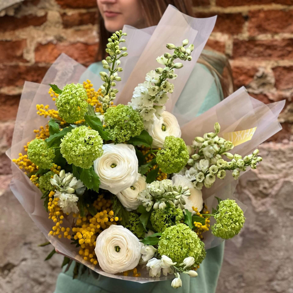 Квіти: Ранункулюс, Мімоза, Вібурнум, Дельфініум