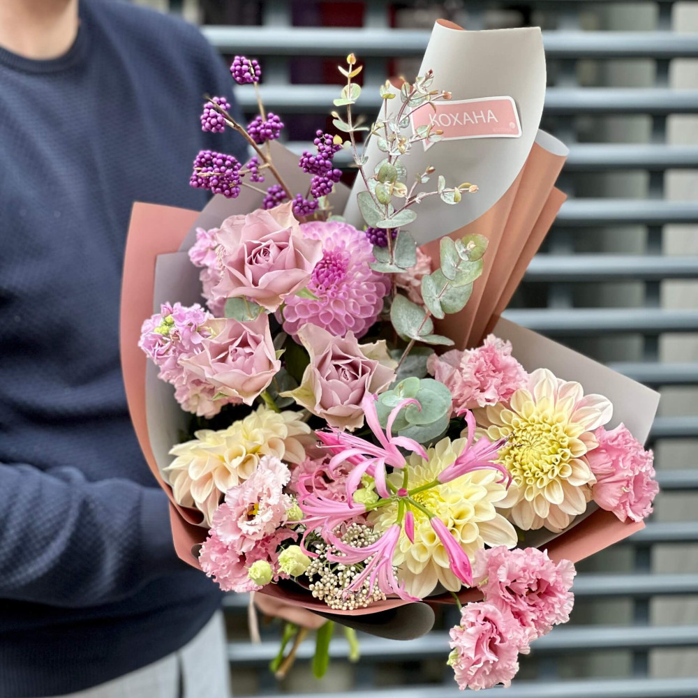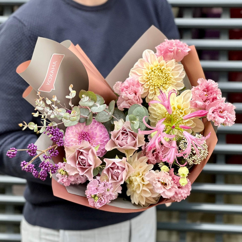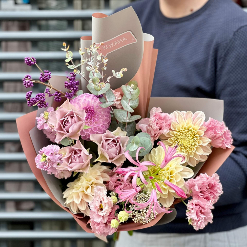 Квіти: Троянда, Еустома, Матіола, Жоржина, Неріне, Озотамнус, Евкаліпт