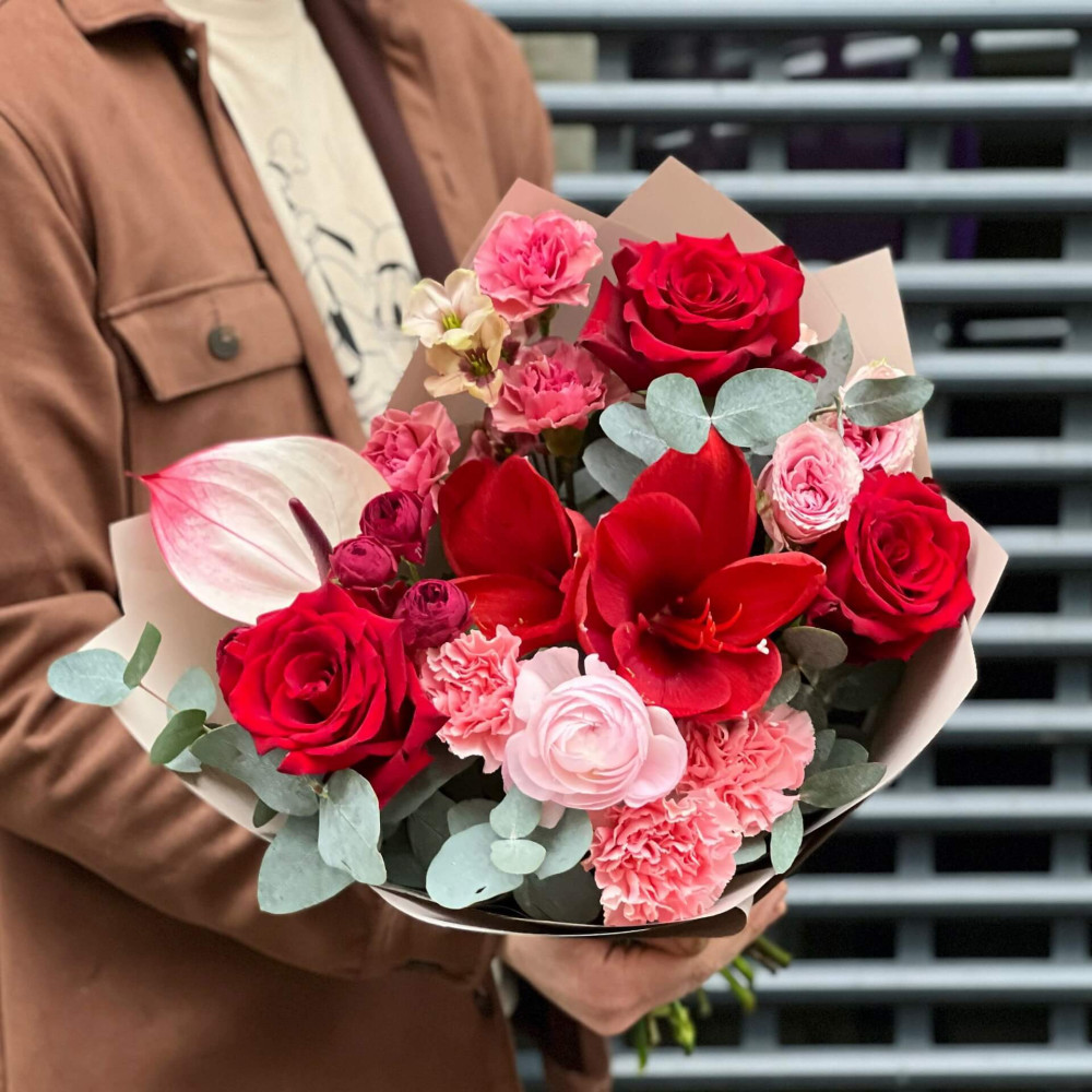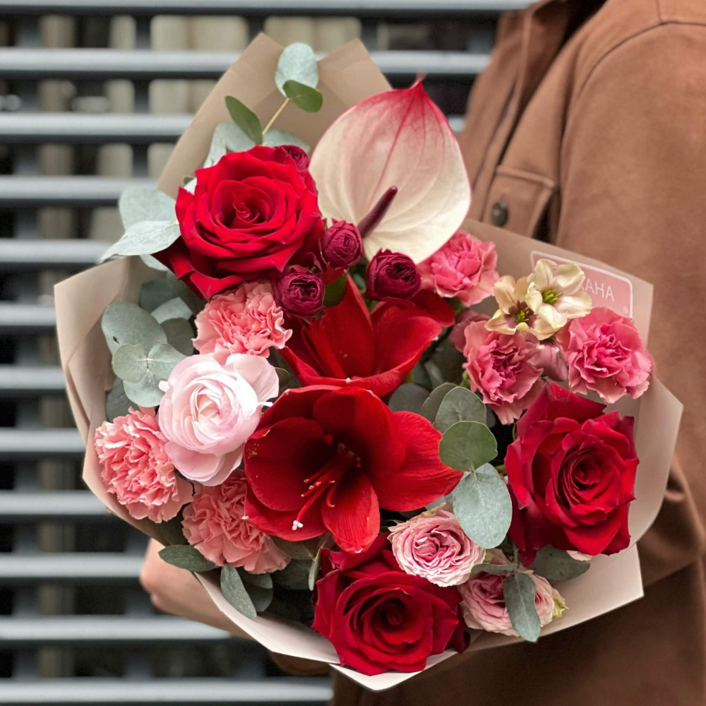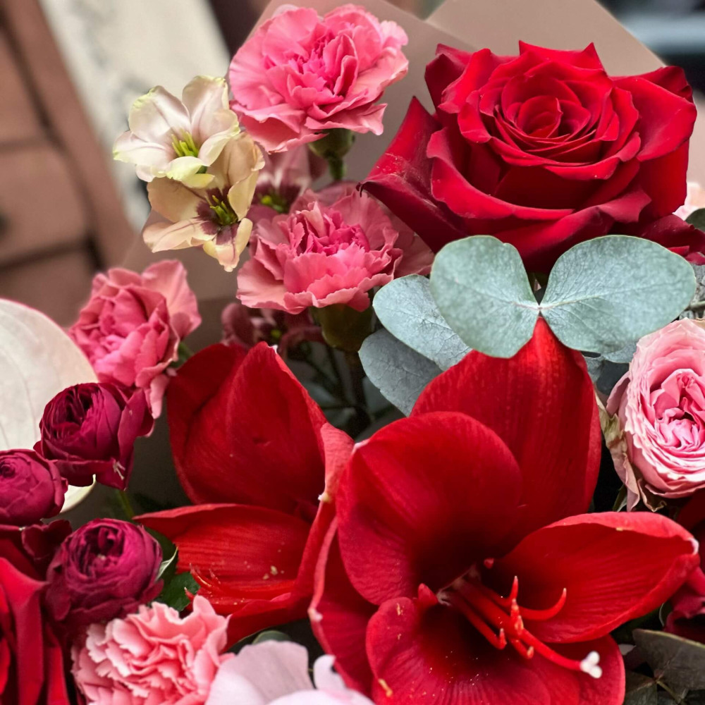 Квіти: Гіпеаструм, Діантус, Троянда, Антуріум, Троянда кущова, Еустома, Евкаліпт