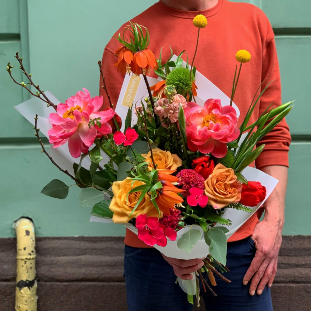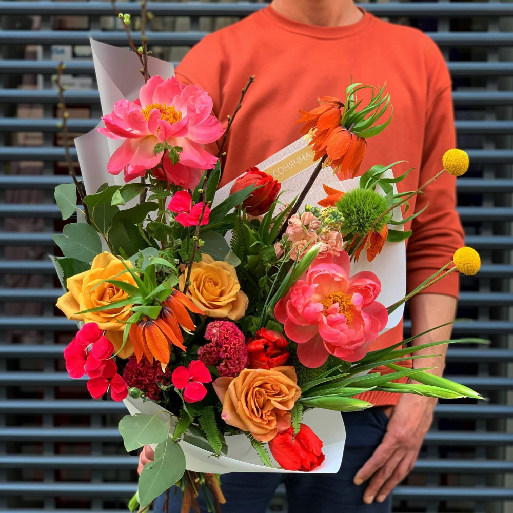 Квіти: Півонія, Діантус, Троянда, Евкаліпт, Краспедія, Целозія, Амбрела, Матіола, Тюльпан